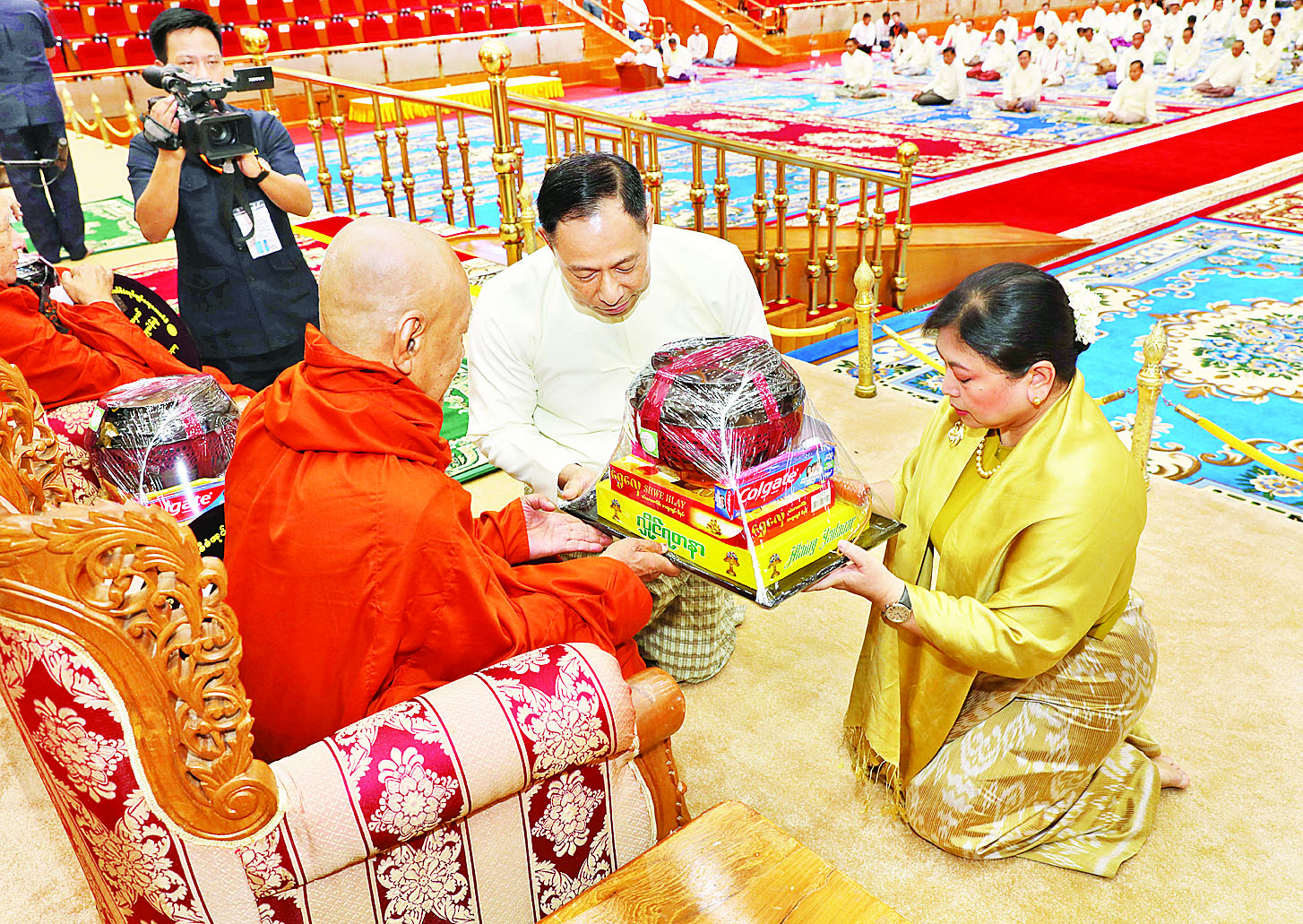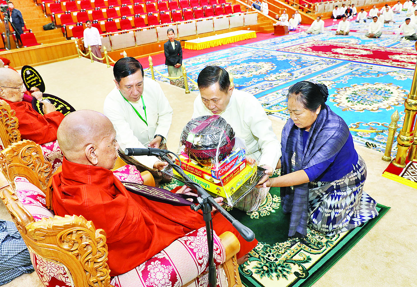 ယင်းနောက် နိုင်ငံတော်စီမံအုပ်ချုပ်ရေးကောင်စီ ဒုတိယဥက္ကဋ္ဌ ဒုတိယဝန်ကြီးချုပ်နှင့်ဇနီးတို့က နိုင်ငံတော်သံဃမဟာ နာယကအဖွဲ့ဥက္ကဋ္ဌ သန်လျင်မင်းကျောင်း ဆရာတော်ကြီး အားလည်းကောင်း၊ကောင်စီ အတွင်းရေးမှူးနှင့်ဇနီးတို့က နိုင်ငံတော် သံဃမဟာနာယကအဖွဲ့ အကျိုးတော်ဆောင်၊ မန္တလေးမြို့မစိုးရိမ်တိုက်သစ် မဟာနာယက ဆရာတော်ကြီးအားလည်းကောင်း၊ ကောင်စီအဖွဲ့ဝင်များနှင့် ဇနီးများ၊ အခမ်းအနားသို့ တက်ရောက်လာသည့် အကြီးအကဲများနှင့် ဇနီးများက ဆရာတော်ကြီးများအားလည်းကောင်း လှူဖွယ်ဝတ္ထုပစ္စည်းများကို ဆက်ကပ်လှူဒါန်းကြသည်။