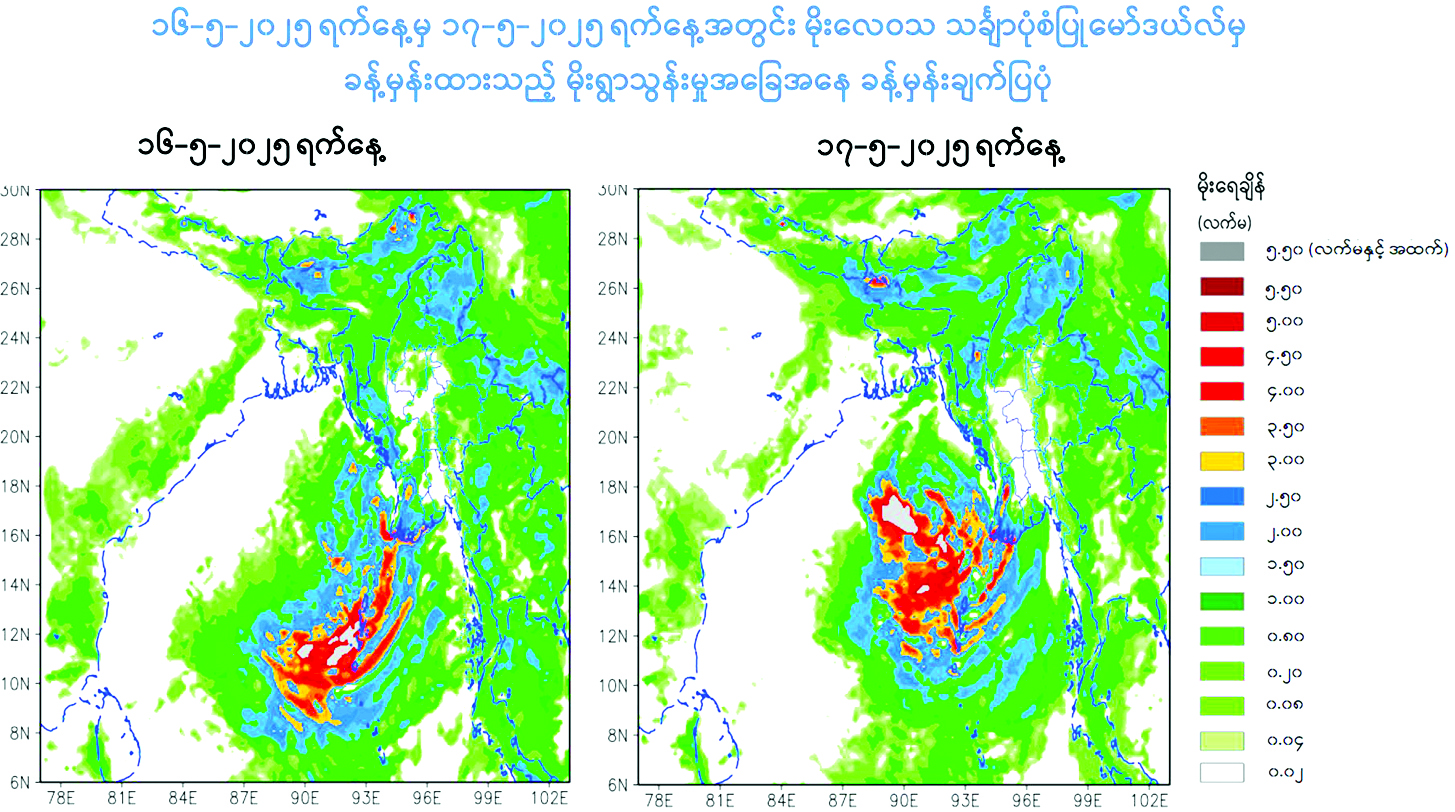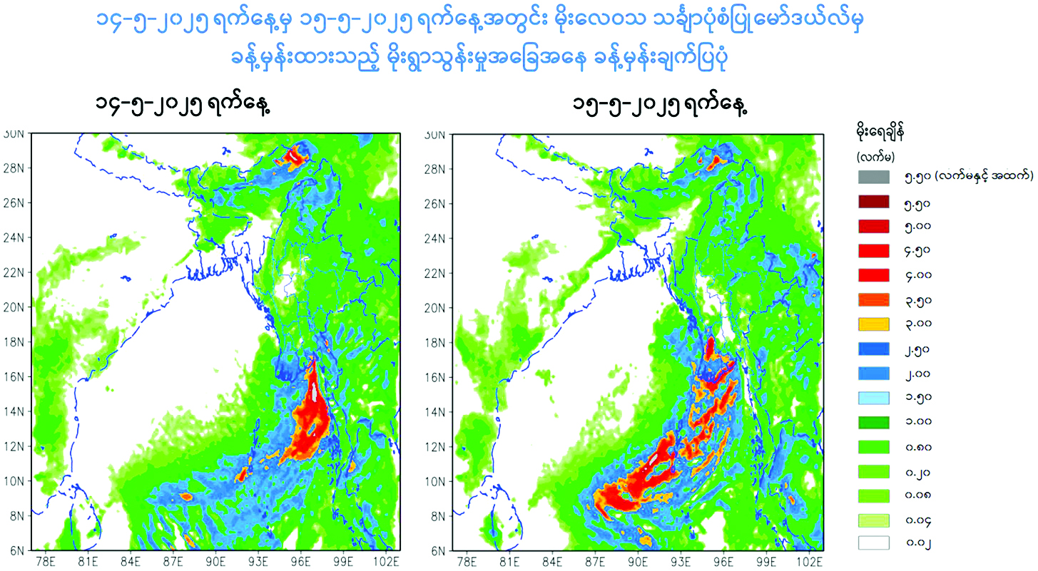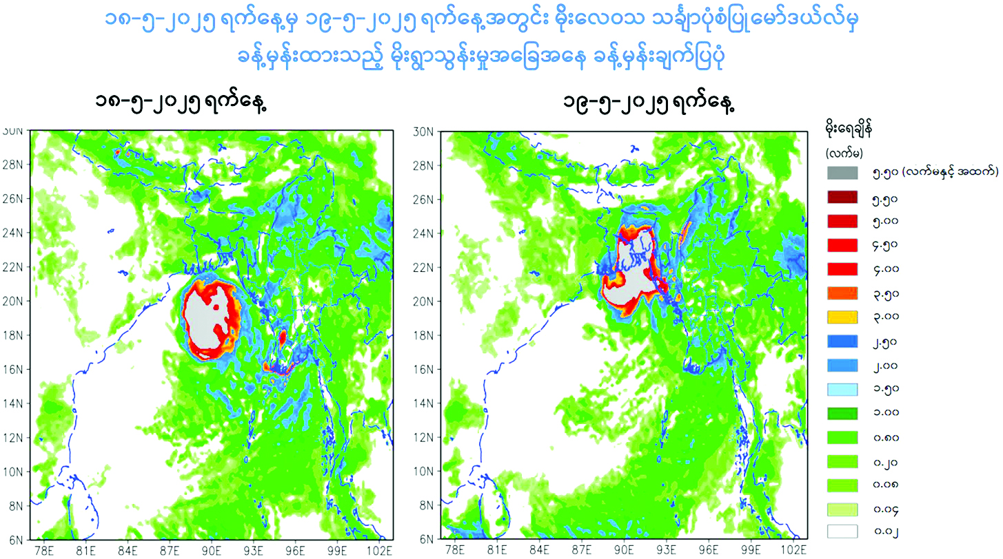 ယနေ့ညနေ ၄ နာရီခွဲ တိုင်းထွာချက်များအရ ကပ္ပလီပင်လယ်ပြင်နှင့် ဘင်္ဂလားပင်လယ်အော်တောင်ပိုင်းတို့တွင် လေထုမငြိမ်မသက်မှုများ ဖြစ်ပေါ်လာနိုင်ခြင်းကြောင့် လည်းကောင်း၊ မုတ်သုံလေဝင်ရောက်လာနိုင်ခြင်းကြောင့်လည်းကောင်း၊ အပူပြန်တက်တိမ်များဖြစ်ထွန်းမှုအားကောင်းခြင်းကြောင့်လည်းကောင်း ယနေ့ညနေမှ မေ ၁၉ ရက် အတွင်း နေပြည်တော်၊ ရန်ကုန်တိုင်းဒေသကြီး၊ မန္တလေးတိုင်းဒေသကြီး၊ ပဲခူးတိုင်းဒေသကြီး၊ မကွေးတိုင်းဒေသကြီး၊ စစ်ကိုင်းတိုင်းဒေသကြီး၊ ဧရာဝတီတိုင်းဒေသကြီး၊ တနင်္သာရီတိုင်းဒေသကြီး၊ ကချင်ပြည်နယ်၊ ကယားပြည်နယ်၊ ကရင်ပြည်နယ်၊ ချင်းပြည်နယ်၊ မွန်ပြည်နယ်၊ ရခိုင်ပြည်နယ်နှင့် ရှမ်းပြည်နယ်တို့တွင် နေရာစိပ်စိပ်မှ နေရာအနှံ့အပြား မိုးထစ်ချုန်းရွာပြီး အချို့ဒေသများတွင် ဒေသအလိုက်နှင့် နေရာကွက်၍ မိုးကြီးနိုင်သည်။