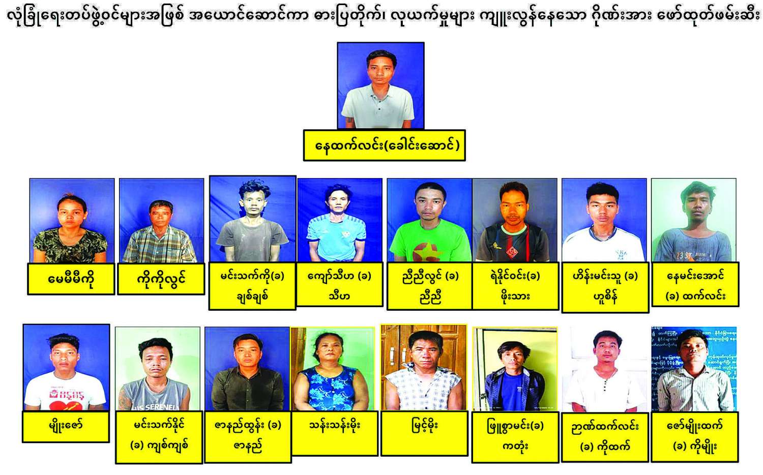 ဖမ်းဆီးရမိတရားခံ နေထက်လင်း၏ ထွက်ဆိုချက်အရ ကွင်းဆက်တရားခံများ ဖမ်းဆီးရမိရေး ဆက်လက်ဖော်ထုတ်ဖမ်းဆီးခဲ့ရာ ဓားပြတိုက်၊ လုယက်မှုများတွင် ပူးပေါင်းပါဝင်ခဲ့သူများဖြစ်သည့် ၎င်း၏ဇနီး မေမီမီကို (၃၁) နှစ် (ဘ) ဦးကိုကိုလွင်၊ စဉ့်ကိုင်မြို့နယ် အရေးမဆိုကျေးရွာနေ ညီညီလွင် (ခ) ညီညီ(၂၉)နှစ်(ဘ)ဦးအေးကို၊ ချမ်းမြသာစည်မြို့နယ် မြရည်နန္ဒာ ရပ်ကွက်နေ ကိုကိုလွင် (၆၅)နှစ် (ဘ)ဦးတင်မောင်လေး၊ အမရပူရမြို့နယ်၊ ရေကြည်ပေါက်ကျေးရွာ နေသူများဖြစ်သည့် ရဲနိုင်ဝင်း (ခ) ဖိုးသား (၃၇)နှစ်(ဘ) ဦးခင်မောင်နှင့် ဟိန်းမင်းသူ(ခ) ဟူစိန်(၂၂)နှစ် (ဘ)ဦးမြင့်စိုး၊ မကွေးတိုင်းဒေသကြီး မင်းလှမြို့ အမှတ် (၁၀)ရပ် ကွက်နေ နေမင်းအောင်(ခ) ထက်လင်း (၂၆)နှစ် (ဘ) ဦးမြင့်မိုး၊ အမရ ပူရမြို့နယ် စာတိုးကျေးရွာနေ မျိုးဇော် (၂၆) နှစ်(ဘ) ဦးမြင့်နောင်၊ ချမ်းမြသာစည်မြို့နယ် အောင်ပင် လယ်ရပ်ကွက်နေသူများဖြစ်သည့် မင်းသက်နိုင် (ခ) ကျစ်ကျစ်(၂၈)နှစ် (ဘ) ဦးကိုကိုလွင်၊ ကျော်သီဟ (ခ) သီဟ (၂၄)နှစ် (ဘ)ဦးကျော်၊ မင်းသက်ကို(ခ) ချစ်ချစ်(၂၃)နှစ် (ဘ)ဦးကိုကိုလွင်၊ ပုသိမ်ကြီးမြို့နယ် ကုလားကြီးကျေးရွာနေ ဇာနည်ထွန်း(ခ) ဇာနည် (၃၈) နှစ် (ဘ) ဦးကြည်လေး၊ နေပြည်တော် သာဝတ္ထိမြို့ စက်ရုံစုရပ်ကွက်နေ ဉာဏ်ထက်လင်း (ခ) ကိုထက် (၃၁)နှစ် (ဘ) ဦးနေမျိုးလှိုင်၊ မုံရွာမြို့ မြဝတီရပ်ကွက်နေသူများဖြစ်သည့် သန်းသန်းမိုး(၅၁)နှစ် (ဘ) ဦးသံချောင်းနှင့် မြင့်မိုး (၅၁) နှစ် (ဘ) ဦးပေါရှိန်၊ အမရပူရမြို့နယ် ဘနောကျေးရွာနေ ဖြူစွာမင်း (ခ) ကတုံး (၃၀) နှစ် (ဘ) ဦးချွတ်၊ ဟုမ္မလင်းမြို့နေ ဇော်မျိုးထက် (ခ) ကိုမျိုး (၃၃)နှစ် (ဘ) ဦးသံချောင်းတို့ပါဝင်သော ဂိုဏ်းအဖွဲ့မှ တရားခံအမျိုးသား ၁၅ ဦး၊ အမျိုးသမီးနှစ်ဦး စုစုပေါင်း ၁၇ ဦးတို့အား ပြစ်မှုကျူးလွန်ရာတွင် အသုံးပြုသည့် ပစ္စတိုသေနတ် လေးလက်၊ မော်တော်ယာဉ်သုံးစီး၊ ဆိုင်ကယ်တစ်စီး၊ ပြောက်ကျားဝတ်စုံလေးစုံတို့နှင့်အတူ ထပ်မံဖော်ထုတ်ဖမ်းဆီးရမိခဲ့သည်။