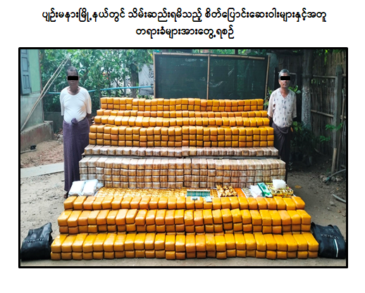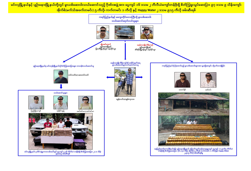 လုံခြုံရေးတပ်ဖွဲ့ဝင်များပါဝင်သော ပူးပေါင်းအဖွဲ့သည် မေလ ၉ ရက်နေ့ မွန်းလွဲ ၂ နာရီခွဲအချိန် မင်းလှမြို့နယ်၊ ပုသိမ်-မုံရွာသွားကားလမ်း၊ ရှမ်းတဲကျေးရွာအနီးတွင် သတင်းအရစောင့်ဆိုင်းနေစဉ် မင်းလှဘက်မှ မင်းတုန်းဘက်သို့ ပြည့်ဖြိုးကျော်မောင်းနှင်ပြီး မဇင်ဇင်ဝေ(ခ)ဇင်ဇင်မာ လိုက်ပါလာသည့် X-TRAIL မော်တော်ယာဉ်နှင့် ရန်နိုင်ထွဋ် မောင်းနှင်ပြီး တင်လတ်လိုက်ပါလာသည့် SURF မော်တော်ယာဉ်တို့ကိုရှာဖွေခဲ့ရာ အဆိုပါယာဉ် ၂ စီးပေါ်မှ စိတ်ကြွရူးသွပ်ဆေးပြား ၂၁ ဒသမ ၈ သိန်း ဖမ်းဆီးရမိခဲ့ပြီး ၎င်းတို့၏ ဖော်ထုတ်ချက်အရ ပျဉ်းမနားမြို့မှ မကွေးတိုင်းဒေသကြီး၊ မင်းတုန်းမြို့နယ်သို့ စိတ်ကြွရူးသွပ်ဆေးပြားများ သယ်ဆောင်ခိုင်းသူ မနန်း(ခ)မျိုးသီရိကျော်နှင့် မျိုးဇော်အောင်တို့ ၂ ဦး၏ မူးယစ်ဆေးဝါးသယ်ဆောင်ရာ၌ အသုံးပြုခဲ့သည့် TOYOTA HILUX SURF မော်တော်ယာဉ်တစ်စီးအား ပျဉ်းမနားမြို့၊ ရန်အောင်(၂)ရပ်ကွက်ရှိ ၎င်းတို့၏နေအိမ်တွင် သိမ်းဆည်းရမိခဲ့ကြောင်း၊ မျိုးဇော်အောင်နှင့် မနန်း(ခ)မျိုးသီရိကျော်တို့သည် ပျဉ်းမနားမြို့နယ်၊ မြောက်လွတ်ကုန်းကျေးရွာရှိအောင်နိုင်၏ နွားခြံစတိုအတွင်း ကရင်ပြည်နယ်သို့ပို့ဆောင်မည့် မူးယစ်ဆေးဝါးများ သိုဝှက်ထားကြောင်းသိရှိရသဖြင့် မူးယစ်ဆေးဝါးတားဆီးနှိမ်နင်းရေးရဲတပ်ဖွဲ့မှ တပ်ဖွဲ့ဝင်များပါဝင်သော ပူးပေါင်းအဖွဲ့သည် မေလ ၁၀ ရက်နေ့ ညနေ ၅ နာရီခွဲအချိန် ပျဉ်းမနားမြို့နယ်၊ မြောက်လွတ်ကုန်းကျေးရွာရှိ အောင်နိုင်၏ နွားမွေးမြူရေးခြံသို့ ဝင်ရောက်ရှာဖွေခဲ့ရာ အောင်နိုင်နှင့် ဇော်ဝင်းတို့ ၂ ဦးအား စိတ်ကြွရူးသွပ်ဆေးပြား ၇၆ ဒသမ ၁၇၈ သိန်း၊ အိုက်စ်(မက်သ်အဖက်တမင်း) ၅ ကီလို၊ ကက်တမင်း ၁ ကီလိုနှင့် စိတ်ပြောင်းဆေးဝါးများ ရောစပ်ထားသည့် Happy Water ၂ ဒသမ ၉၁၅ ကီလိုတို့နှင့်အတူ ထပ်မံဖမ်းဆီးရမိခဲ့သဖြင့် စုစုပေါင်းဒေသတန်ဖိုးငွေ ၁၆ ဒသမ ၂ ဘီလီယံတန်ဖိုးရှိ စိတ်ကြွရူးသွပ်ဆေးပြား ၉၇ ဒသမ ၉ သိန်းကျော်၊ အိုက်စ်(မက်သ်အဖက်တမင်း) ၅ ကီလို၊ ကက်တမင်း ၁ ကီလိုနှင့် စိတ်ပြောင်းဆေးဝါးများ ရောစပ်ထားသည့် Happy Water ၂ ဒသမ ၉၁၅ ကီလို ဖမ်းဆီးရမိခဲ့ကြောင်းနှင့် မေလ ၁၁ ရက်နေ့ နံနက် ၉ နာရီခွဲအချိန် စိတ်ကြွရူးသွပ်ဆေးပြားများ တင်ဆောင်ပေးသူထွန်းလင်း(ခ) ရှမ်းကုလားအား ပဲခူးတိုင်းဒေသကြီး၊ ဝေါမြို့နယ်၊ ညောင်ခါးရှည်ကျေးရွာအနီးတွင် မော်တော်ဆိုင်ကယ်တစ်စီးနှင့်အတူ ဖမ်းဆီးရမိခဲ့ကြောင်း၊ စစ်ဆေးဖော်ထုတ်ချက်များအရ မျိုးဇော်အောင်နှင့် မနန်း(ခ) မျိုးသီရိကျော်တို့သည် ရှမ်းပြည်နယ်မှ သယ်ဆောင်လာသော မူးယစ်ဆေးဝါးများကို ပျဉ်းမနားမြို့နယ်မှတစ်ဆင့် မင်းတုန်းမြို့နယ်သို့ သယ်ဆောင်ရောင်းဝယ်ရာတွင် တင်လတ်(ခ) စောတင်လတ်မှ တာဝန်ခံ၍ ပြည့်ဖြို