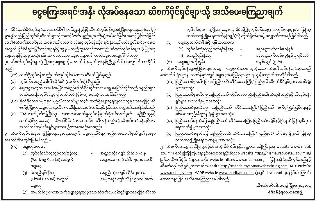 ငွေကြေးအရင်းအနှီး လိုအပ်နေသော ဆီစက်ပိုင်ရှင်များသို့ အသိပေးကြေညာချက်