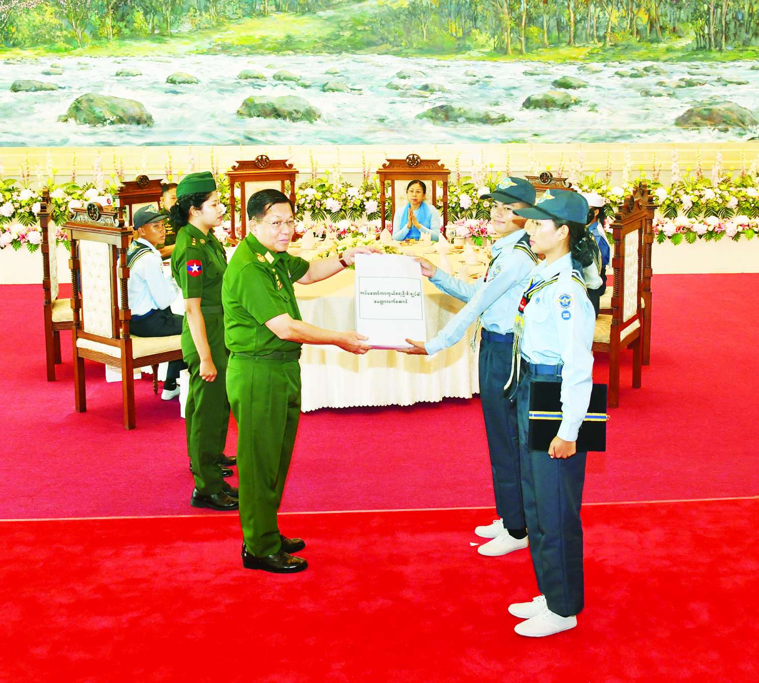 ယင်းနောက် နိုင်ငံတော်စီမံအုပ်ချုပ်ရေးကောင်စီဥက္ကဋ္ဌ တပ်မတော်ကာကွယ်ရေးဦးစီးချုပ်က ရေကြောင်းနှင့် လေကြောင်းလူငယ်မောင်မယ်များအတွက် အမှတ်တရ လက်ဆောင်ပစ္စည်းများ ပေးအပ်ပြီး လူငယ်မောင်မယ်များက နိုင်ငံတော်စီမံအုပ်ချုပ်ရေးကောင်စီဥက္ကဋ္ဌ တပ်မတော်ကာကွယ်ရေးဦးစီးချုပ်အား ဂါဝရပြုလက်ဆောင်ပစ္စည်းများ ပြန်လည်ပေးအပ်သည်။