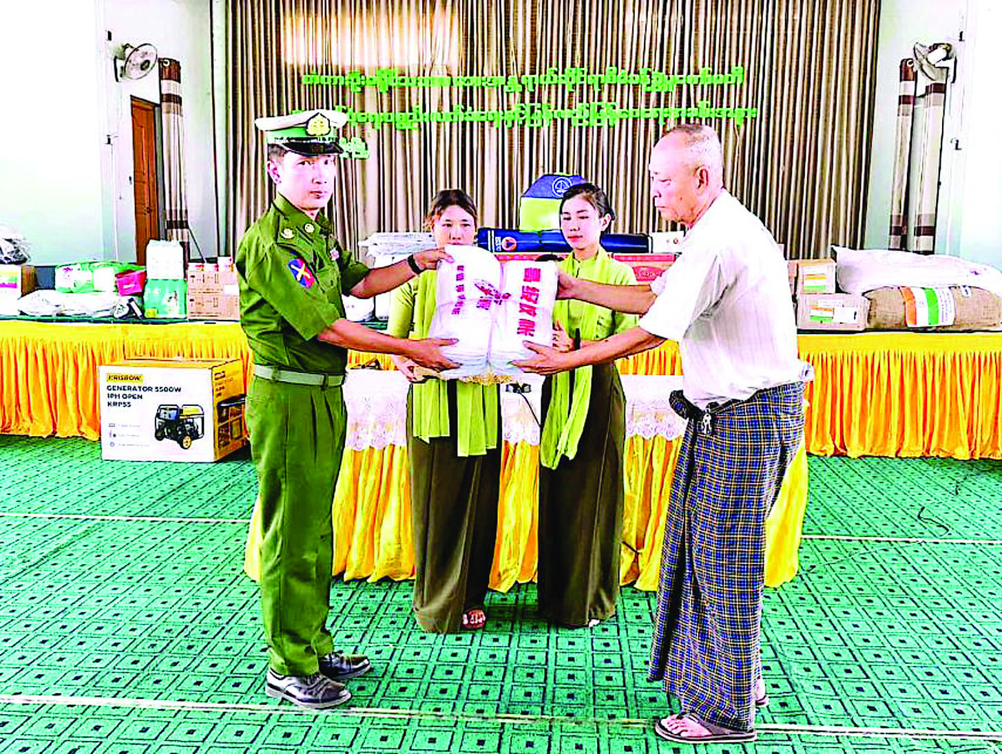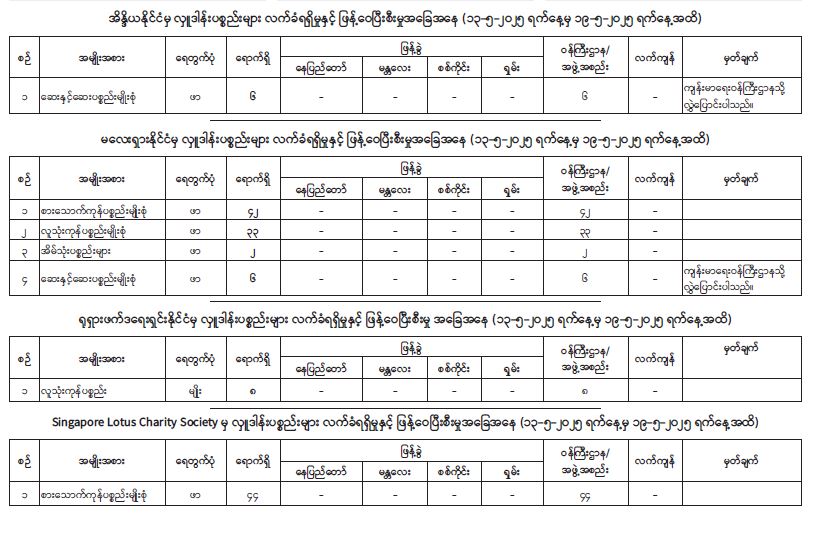 ယခုအခါ မေလ ၁၃ ရက်နေ့မှ ၁၉ ရက်နေ့အထိ ရက်သတ္တပတ် ၁ ပတ်အတွင်း အိန္ဒိယနိုင်ငံ၊ မလေးရှားနိုင်ငံ၊ ရုရှားဖက်ဒရေးရှင်းနိုင်ငံနှင့် Singapore Lotus Charity Society တို့မှ ထပ်မံ ပေးပို့လှူဒါန်းလာသော စားသောက်ကုန်ပစ္စည်း၊ လူသုံးကုန်ပစ္စည်း၊ အိမ်သုံးပစ္စည်း၊ ဆေးနှင့် ဆေးပစ္စည်းများအနက် ဆေးနှင့် ဆေးပစ္စည်းများကို ကျန်းမာရေးစောင့်ရှောက်မှု လုပ်ငန်းကော်မတီ (ကျန်းမာရေးဝန်ကြီးဌာန) သို့လည်းကောင်း၊ စားသောက်ကုန်ပစ္စည်း၊ လူသုံးကုန်ပစ္စည်း၊ အိမ်သုံးပစ္စည်းများကို နေပြည်တော်အတွင်းရှိ လိုအပ်သည့် ဝန်ကြီးဌာနများသို့လည်းကောင်း လွှဲပြောင်းထောက်ပံ့ပေးခဲ့ပါသည်။