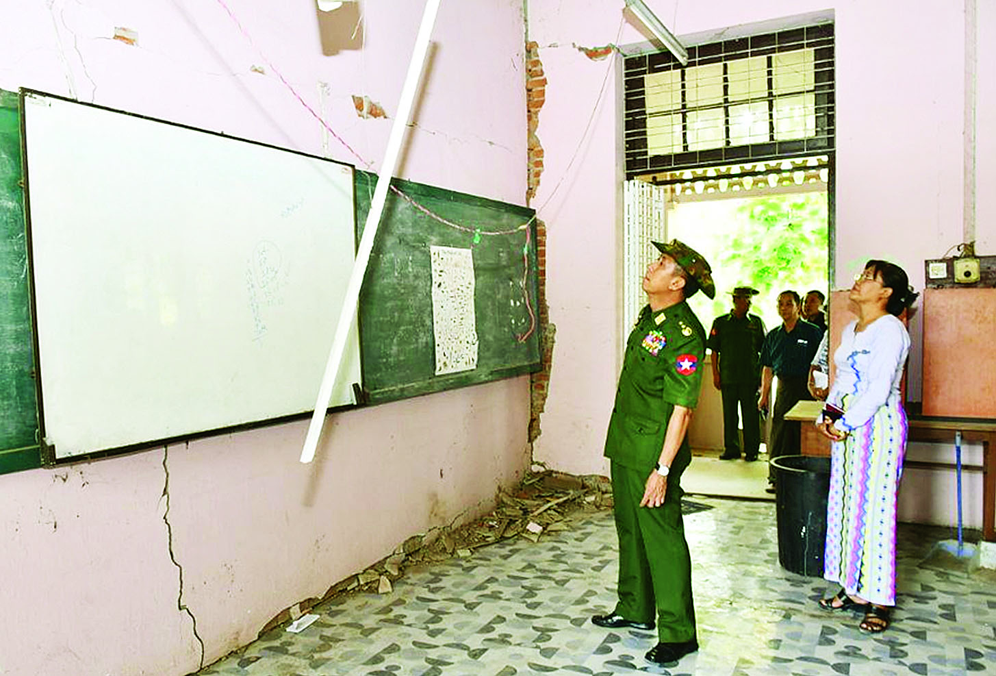 ထို့အတူ ကာကွယ်ရေးဦးစီးချုပ်ရုံး (ကြည်း) မှ ဒုတိယဗိုလ်ချုပ်ကြီး မျိုးသန့်နိုင်နှင့် တာဝန်ရှိသူများသည် ကျောက်ဆည်ခရိုင် စဉ့်ကိုင်မြို့နယ်ရှိ ကျောက်ဆည်တက္ကသိုလ်၌ ငလျင်ဒဏ်ကြောင့် ပျက်စီးသွားသော အပျက်အစီးများကို ပြန်လည်ပြုပြင်ဆောင်ရွက်နေမှုများနှင့် ပြင်ဆင်ထိန်းသိမ်း ခြင်းလုပ်ငန်း ဆောင်ရွက်နေမှုများ၊ ကွန်ပျူတာတက္ကသိုလ် (မန္တလေး) ၌ ငလျင်ဒဏ်ကြောင့် စာမေးပွဲ ဖြေဆိုရန် ရပ်တန့်ခဲ့ရသော ကျောင်းသား ကျောင်းသူများ စာမေးပွဲပြန်လည်ဖြေဆိုနေမှုများနှင့် ယာယီစာသင်ဆောင်များ ဆောက်လုပ်နေမှုများ၊ တရုတ်စုရပ်ကွက် မျက်စိအထူးကုဆေးရုံရှိ ငလျင်ဒဏ်ကြောင့် ထိခိုက်ပျက်စီးခဲ့သော အဆောက်အအုံများနှင့် ဆေးကုသမှုများ ဆောင်ရွက်ပေးနေမှုများကို သွားရောက်ကြည့်ရှုစစ်ဆေးပြီး လိုအပ်သည်များ ပေါင်းစပ်ညှိနှိုင်း ဆောင်ရွက်ပေးသည်။