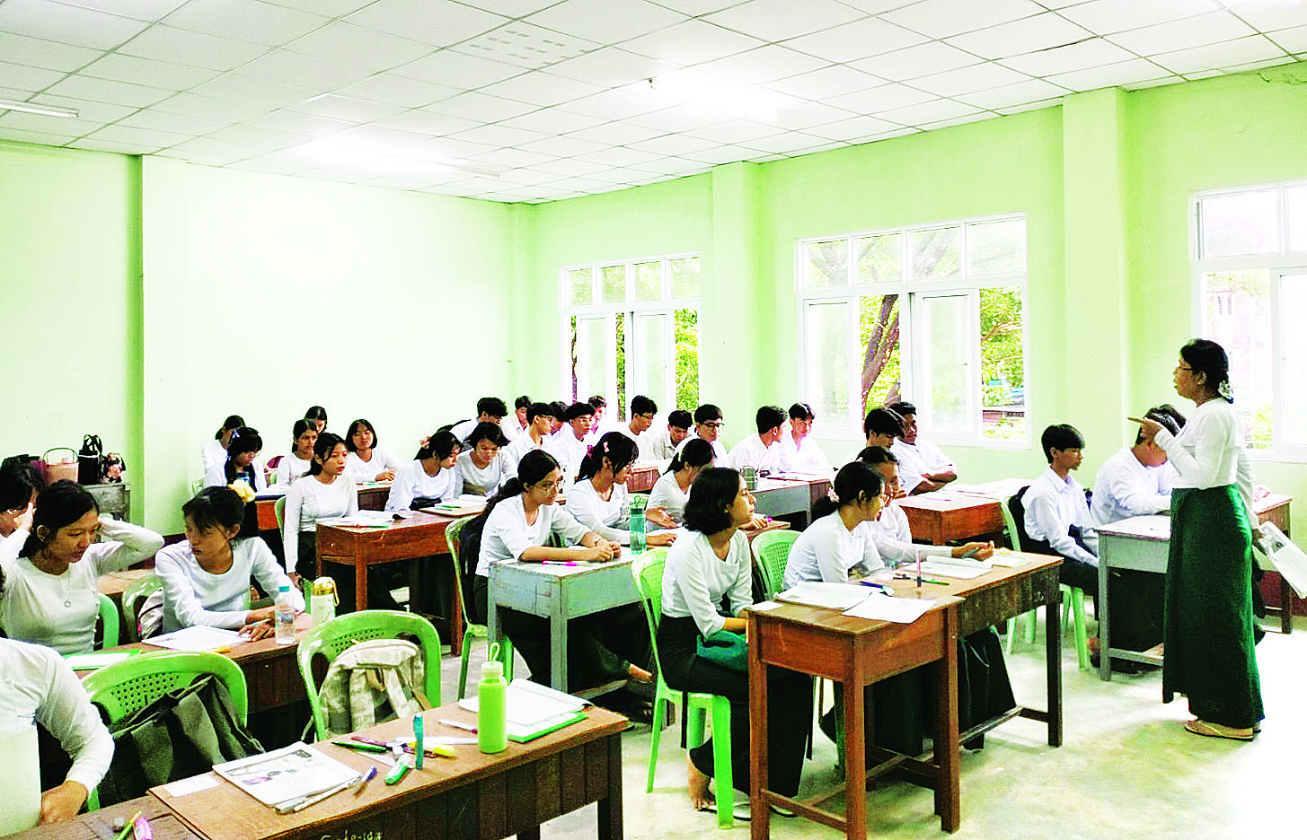၂၀၂၅-၂၀၂၆ ပညာသင်နှစ်မှာတော့ ကျွန်မတို့ကျောင်းမှာ ကျောင်းသားဦးရေ ၁၅၂၀ တက်ရောက်နေပါတယ်။ မနှစ်ကကျောင်းသားဦးရေကို ပြည့်မီဖို့တော့ ၁၀၀ကျော် လိုပါသေးတယ်။ ဒီဇွန်လကုန်မှာတော့ ယခင်နှစ်က ကျောင်းသားဦးရေအတိုင်း ပြည့်မီမယ်လို့ ခန့်မှန်းထားရှိပါတယ်။ ဘာသာရပ်ခွဲဝေ မှုအနေနဲ့ကတော့ ကျွန်မတို့က တစ်နေ့ကို စာသင်ချိန် ရှစ်ချိန်နဲ့ တစ်ပတ်ကိုစာသင်ချိန် အချိန်ပေါင်း ၄၀ နဲ့ သင်ကြားပို့ချပေးပါတယ်။ အလယ်တန်းအဆင့် ကျောင်းသား ကျောင်းသူတွေမှာတော့ တစ်ပတ် တစ်ကြိမ် စာဖတ်ချိန်ဆိုပြီးတော့ ကျောင်းသားလူငယ်တွေရဲ့ အသိပညာမြင့်မားဖို့အတွက် စာကြည့်တိုက်မှာ စာဖတ်ချိန်အဖြစ် စာဖတ်ရှိန်မြှင့်တင်ရေးလုပ်ငန်းတွေကို ဆောင်ရွက်လျက်ရှိပါတယ်။ အထက်တန်းအဆင့်မှာတော့ ကျွန်မတို့က ကျောင်းသားလူငယ်တွေဟာ အရင်တုန်းက စနစ်ဟောင်းပညာရေးမှာကျတော့ ကျွန်မတို့က ဆယ်တန်းကို အသက် ၁၆ နှစ်မှာ အောင်မြင်ပါတယ်။ အခုစနစ်သစ်ပညာရေးသည် အသက်၁၈နှစ်မှာ Grade-12 ကို အောင်မြင်မှာဖြစ်တဲ့အတွက် အသက် ၁၈ နှစ်ဖြစ်တဲ့ ဒီကျောင်းသား လူငယ်တွေဟာ ကျောင်းသားတွေရဲ့ အခွင့်အရေး၊ နိုင်ငံသားတိုင်းရဲ့ အခွင့်အရေးဟာ မဲပေးပိုင်ခွင့်ဆန္ဒရှိတဲ့ ကျောင်းသားလူငယ်တွေ အခြေခံပညာရေးကဏ္ဍမှာ ပါဝင်လာပါတယ်။ ဒါကြောင့် ကျွန်မတို့က ကျောင်းသားလူငယ်တွေကို သူတို့ရဲ့အခွင့်အရေးတွေ၊ နိုင်ငံသားတိုင်းရဲ့ အခွင့်အရေးတွေ၊ ဥပဒေအကြောင်းအရာတွေကို သိဖို့အတွက် တစ်ပတ်စာ သင်ချိန် တစ်ချိန်ကို ဥပဒေရေးရာချိန်အဖြစ် ထည့်သွင်းသင်ကြားပေးလျက်ရှိပါတယ်။ ဥပဒေရေးရာအချိန်မှာတော့ နိုင်ငံတော်ဖွဲ့စည်းပုံအခြေခံဥပဒေအကြောင်းတွေကို သင်ကြားပေးပါတယ်။ နောက်ပြီး ယာဉ်စည်းကမ်း၊ လမ်းစည်းကမ်း၊ နိုင်ငံသားတိုင်းလိုက်နာရမယ့် စည်းမျဉ်းစည်းကမ်းတွေအားလုံးကို သင်ကြားပေးနေပါတယ်ရှင်။