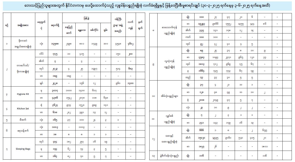 ယခုအခါ မေလ ၂၈ ရက်နေ့မှ ဇွန်လ ၃ ရက်နေ့အထိ ရက်သတ္တပတ် ၁ ပတ်အတွင်း သီရိလင်္ကာ နိုင်ငံမှထပ်မံပေးပို့လှူဒါန်းလာ သောစားသောက်ကုန်၊ လူသုံးကုန်၊ အိမ်သုံးပစ္စည်း၊ လျှပ်စစ်ပစ္စည်း၊ ဆေးနှင့်ဆေးပစ္စည်းများအနက် ဆေးနှင့်ဆေးပစ္စည်းများကို ကျန်းမာရေးစောင့်ရှောက်မှု လုပ်ငန်းကော်မတီ (ကျန်းမာရေးဝန်ကြီးဌာန) သို့လည်းကောင်း၊ စားသောက်ကုန်၊ လူသုံးကုန်၊ အိမ်သုံးပစ္စည်း၊ လျှပ်စစ်ပစ္စည်းများကို ဘေးသင့်လူဦးရေအချိုး အစားအပေါ်မူတည်၍ နေပြည်တော်၊ စစ်ကိုင်းတိုင်းဒေသကြီး၊ မန္တလေးတိုင်းဒေသကြီးနှင့် ရှမ်းပြည်နယ်တို့သို့ဖြန့်ခွဲပေးပို့ပြီး ဖြစ်ပါသည်။