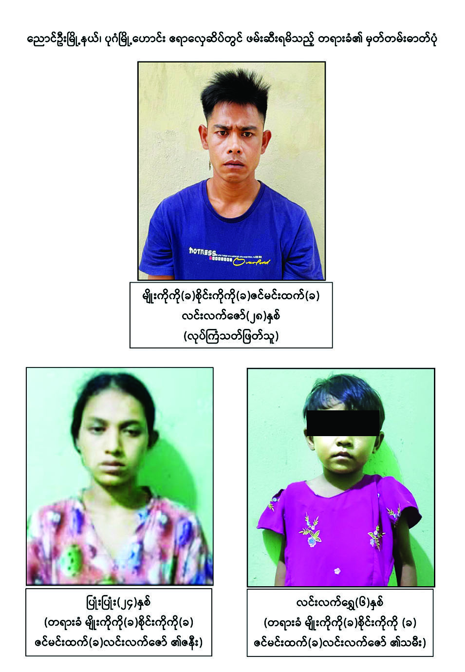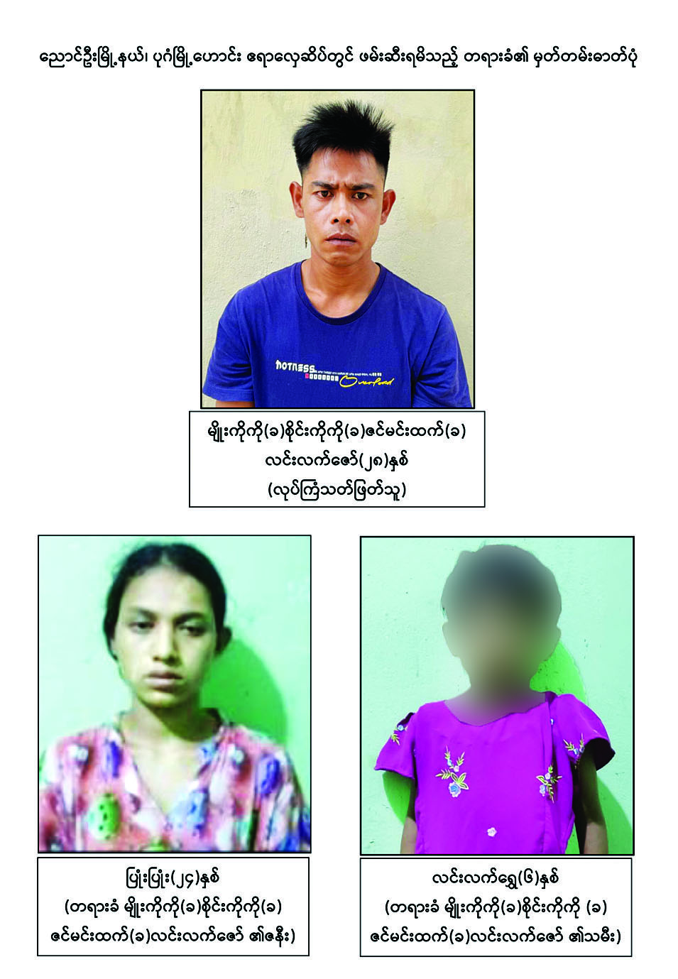 ဖမ်းဆီးရမိတရားခံများ၏ ထွက်ဆိုချက်အရ မေ ၂၅ ရက်တွင် ဦးချိုထွန်းအောင်အား လုပ်ကြံသတ်ဖြတ်ခဲ့ပြီး ထွက်ပြေးတိမ်းရှောင်နေသည့် တရားခံမျိုးကိုကို(ခ)စိုင်းကိုကို(ခ) ဇင်မင်းထက်(ခ)လင်း လက်ဇော်(၂၈)နှစ်၊ ၎င်း၏ဇနီးဖြစ်သူ ပြုံးပြုံး(၂၄)နှစ်၊ သမီးဖြစ်သူလင်းလက်ရွှေ (၆)နှစ်တို့အား ညောင်ဦးမြို့နယ် ပုဂံမြို့ဟောင်းတွင်လည်းကောင်း၊ ၎င်းတို့အား လိုက်ပါပို့ဆောင်ပေးခဲ့သည့် ယာဉ်မောင်း အောင်ဆန်းဟိန်း(၂၅)နှစ်နှင့် ချိတ်ဆက်ဆောင်ရွက်ပေးသူ ညီညီလှိုင်(၃၉)နှစ်တို့အား မွန်ပြည်နယ် မုဒုံမြို့တွင်လည်းကောင်း အသီးသီးဖမ်းဆီးရမိ ခဲ့သည်။