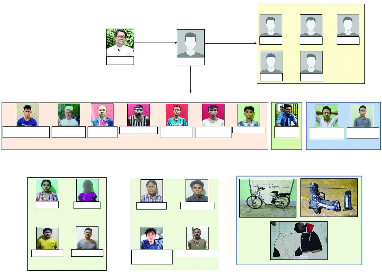 ဖမ်းဆီးရမိတရားခံများ၏ထွက်ဆိုချက်အရ မေ ၂၉ ရက်တွင် ဦးချိုထွန်းအောင်အား လုပ်ကြံသတ်ဖြတ်မှုအပါအဝင် ၎င်းတို့အကြမ်းဖက်အဖွဲ့ဆောင်ရွက်ခဲ့သော လုပ်ကြံသတ်ဖြတ်မှုများ၌ Scout ကြည့်ရှုပေးခဲ့သည့် တရားခံ မင်းစည်သူ(ခ)အငယ်လေး (၂၉)နှစ်နှင့် ကျော်ဇင်သန့်(ခ)လွင်ကြီး(ခ) ကျော်ဇင်(၃၃)နှစ်တို့အား ကြည့်မြင်တိုင်မြို့နယ် ဈေးကလေးရပ်ကွက် ဈေးကလေးလမ်း အမှတ်(၁၇၇)ရှိ နေအိမ်၌လည်း ကောင်း၊ တရားခံ ဟန်လင်းအောင် (၂၈)နှစ်၊ ကြည့် မြင်တိုင်မြို့နယ် သီတာရပ်ကွက် သိန္နိလမ်းအမှတ် (၃၂)နေသူအားလည်းကောင်း အသီးသီးထပ်မံ ဖမ်းဆီးရမိခဲ့သည်။