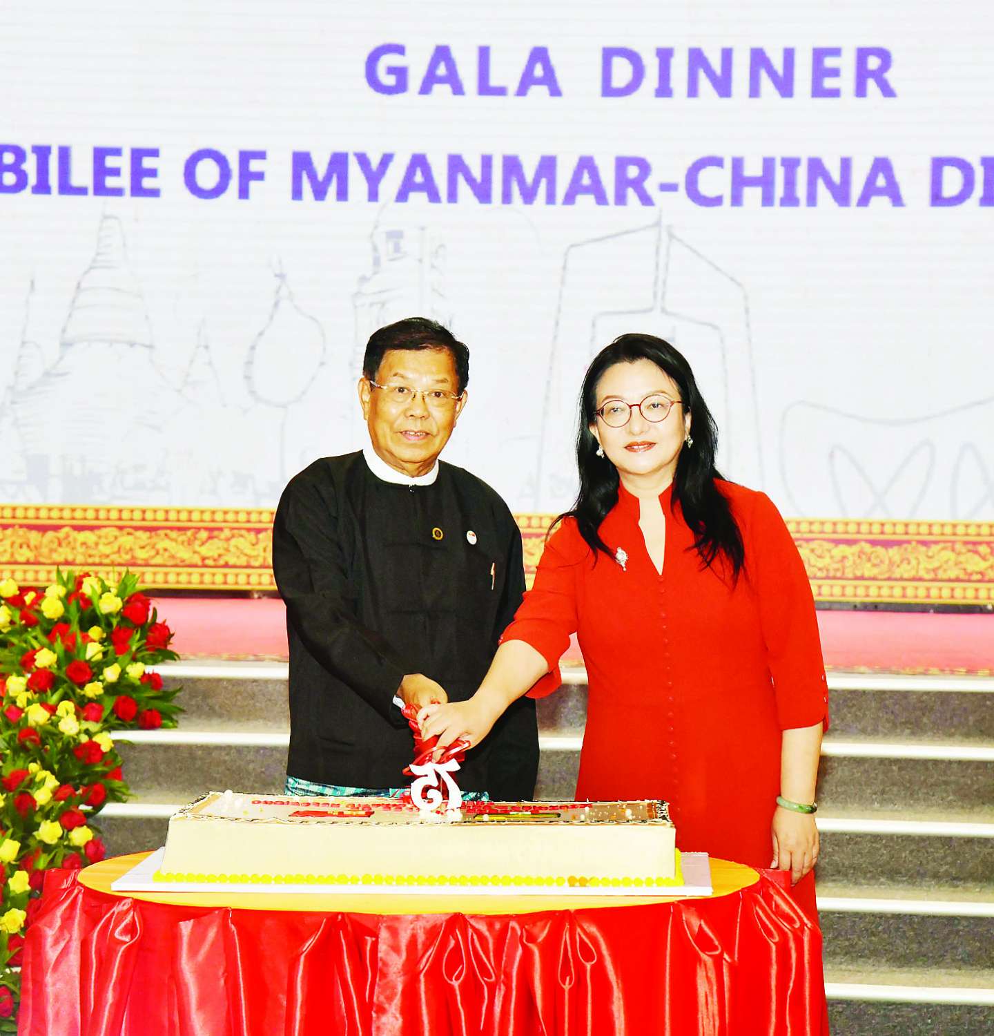 ဆက်လက်၍ ဒုတိယဝန်ကြီးချုပ်နှင့် ပြည်ထောင်စုဝန်ကြီးနှင့် တရုတ်သံအမတ်ကြီးတို့က မြန်မာ-တရုတ် နှစ်နိုင်ငံသံတမန်ဆက်ဆံရေးထူထောင်မှု (၇၅) နှစ်မြောက် စိန်ရတုအထိမ်းအမှတ် ဂုဏ်ပြုကိတ်ကို လှီးဖြတ်ပေးကြပြီး တက်ရောက်လာကြသည့် ဧည့်သည်တော်များနှင့် မှတ်တမ်းတင် ဓာတ်ပုံရိုက်ကြသည်။