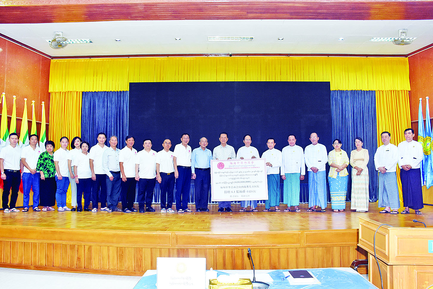 အခမ်းအနားတွင် အလှူရှင်အသင်းအဖွဲ့များက လှူဒါန်းရသည့် အကြောင်းရင်းကို ရှင်းလင်းတင်ပြကြပြီး မြန်မာနိုင်ငံ တရုတ်ကုန်သည်များအသင်းချုပ်က ငလျင်ဒဏ်ကြောင့်ပျက်စီးသွားသော နေပြည်တော်ကလေးရောဂါအထူးကုဆေးရုံကြီးနှင့် သားဖွားမီးယပ်ရောဂါအထူးကုဆေးရုံကြီးတို့ရှိ ဆေးရုံအဆောက်အအုံများပြုပြင်ရန် ငွေကျပ် ၁၀၄၈ ဒသမ ၀၀၀ သန်း၊ မြန်မာ-တရုတ် အမျိုးသားကုသိုလ်ဖြစ်အသင်းက ငလျင်ဒဏ်ကြောင့်ပျက်စီးသွားသော နေပြည်တော် သားဖွားမီးယပ်ရောဂါ အထူးကုဆေးရုံကြီး မီးယပ်ဆောင်နှင့်ခွဲစိတ်ဆောင်ပြုပြင်ရန် ငွေကျပ် ၁၁၃ ဒသမ ၀၀၀ သန်း၊ မြန်မာနိုင်ငံဆေးနှင့် ဆေးပစ္စည်းလုပ်ငန်းရှင်များအသင်းက ငလျင်ဒဏ်ကြောင့်ပျက်စီးသွားသော အစားအသောက်နှင့်ဆေးဝါးကွပ်ကဲရေးဦးစီးဌာန ဓာတ်ခွဲခန်းပြုပြင်ရန် ငွေကျပ် ၇၈ ဒသမ ၁၇၅ သန်း၊ Medi-Health Co., Ltd နှင့် Drug International Ltd တို့က ပြည်သူ့ကျန်းမာရေးဦးစီးဌာနတွင် အသုံးပြုရန် Modular Office နှစ်လုံးအတွက် ငွေကျပ်သိန်း ၉၅၀ နှင့် မြန်မာတရုတ်အမျိုးသမီးများအသင်းက ငွေကျပ်သိန်း ၁၅၀ တို့ကို ပေးအပ်လှူဒါန်းကြရာ ပြည်ထောင်စုဝန်ကြီးနှင့် တာဝန်ရှိသူများက လက်ခံရယူကြပြီး ဂုဏ်ပြုမှတ်တမ်းလွှာများ ပြန်လည်ပေးအပ်ကာ ကျေးဇူးတင်စကားပြောကြားသည်။