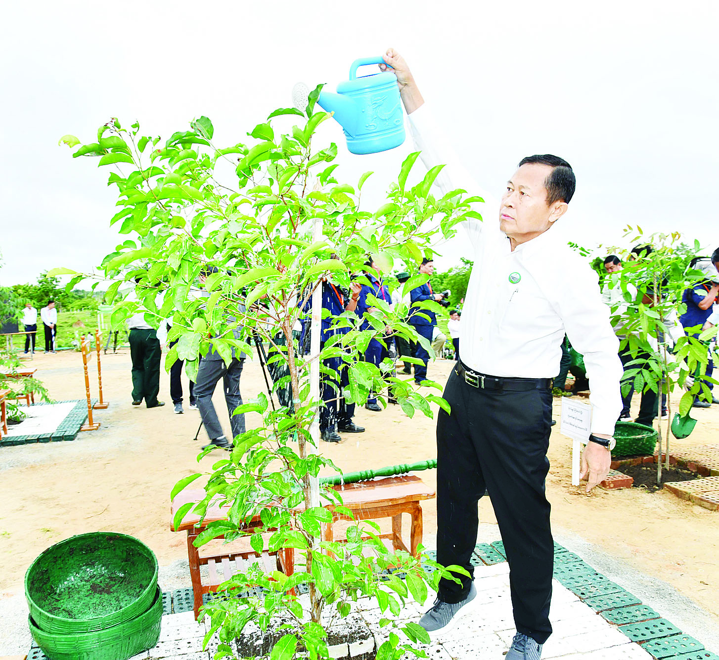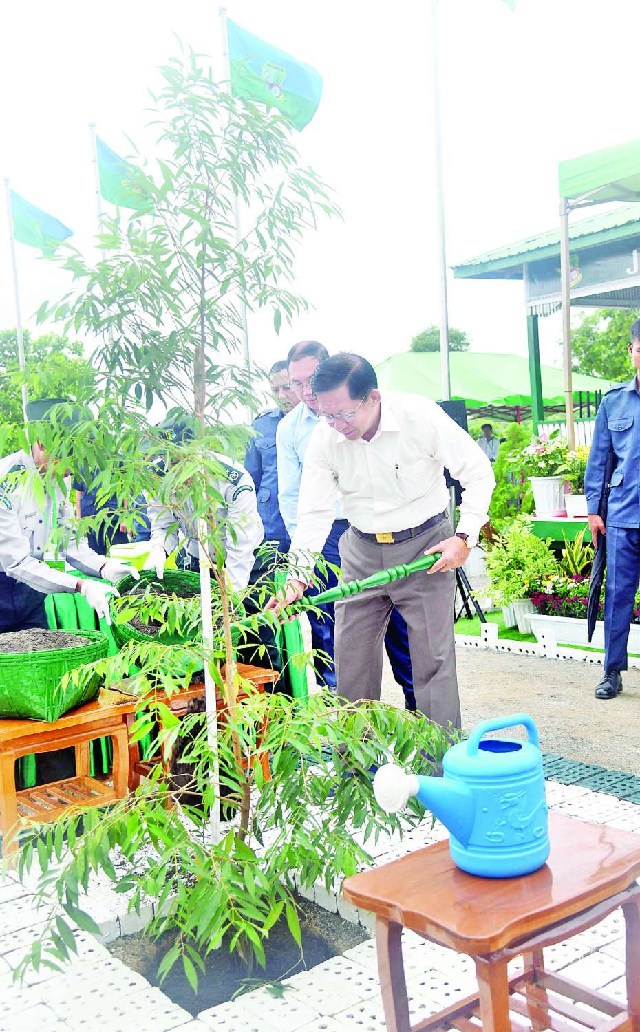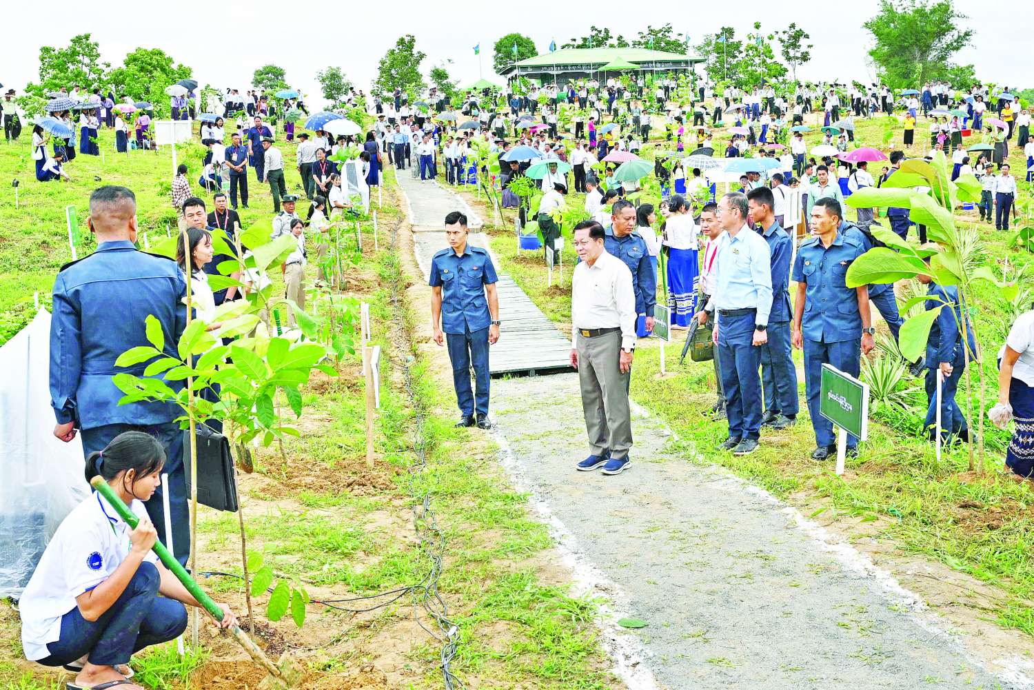 ယင်းနောက်အခမ်းအနားသို့ တက်ရောက်လာကြသည့် နိုင်ငံတော်စီမံအုပ်ချုပ်ရေးကောင်စီဒုတိယဥက္ကဋ္ဌ ဒုတိယဝန်ကြီးချုပ် ဒုတိယဗိုလ်ချုပ်မှူးကြီး စိုးဝင်း၊ ကောင်စီအတွင်းရေးမှူး၊ တွဲဖက်အတွင်းရေးမှူး၊ ကောင်စီအဖွဲ့ဝင်များ၊ ပြည်ထောင်စုအဆင့်ပုဂ္ဂိုလ်များနှင့် ပြည်ထောင်စုဝန်ကြီးများ၊ ဖိတ်ကြားထားသည့် ဧည့်သည်တော်ကြီးများနှင့် ကျောင်းသား၊ ကျောင်းသူများ၊ ဝန်ကြီးဌာနများမှ ဌာနဆိုင်ရာ အရာထမ်း၊ အမှုထမ်းများနှင့် တာဝန်ရှိသူများသည် ပျိုးပင်များကို တစ်ပြိုင်တည်း စိုက်ပျိုးပေးကြသည်။