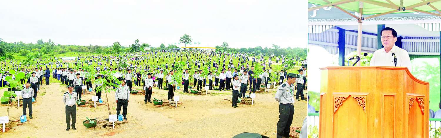 နိုင်ငံတော်အနေဖြင့် ၂၀၂၁ ခုနှစ် မိုးရာသီမှ ၂၀၂၄ ခုနှစ် မိုးရာသီအထိ နိုင်ငံအဝန်းတွင် ပျိုးပင်စုစုပေါင်း ၉၀ ဒသမ ၅၅ သန်းကျော် ဖြန့်ဝေစိုက်ပျိုးပေးနိုင်ခဲ့ကြောင်း၊ နေပြည်တော်တွင် မိမိကိုယ်တိုင်ဦးဆောင်မှုနှင့် သစ်ပင်စိုက်ပျိုးပွဲ(၉)ကြိမ် ပြုလုပ်ခဲ့ပြီး (၃,၂၀၉,၇၀၃)ပင် စိုက်ပျိုးနိုင်ခဲ့ကြောင်း၊ ရှင်သန်ဖြစ်ထွန်းမှု (၃,၀၃၂,၉၈၂)ပင် (၉၄ ရာခိုင်နှုန်း)ရှိကြောင်း၊ ဖြန့်ဝေစိုက်ပျိုးခဲ့သည့် သစ်ပင်များသည် သစ်တောနယ်မြေများဖြစ်သည့် ကြိုးဝိုင်း၊ ကြိုးပြင်ကာကွယ်တောများအတွင်း၌ စိုက်ပျိုးခြင်းသာမကပဲ သစ်တောနယ်မြေ ပြင်ပနေရာများ၌လည်း ဌာနဆိုင်ရာများနှင့် ဒေသခံပြည်သူများက မိုးရာသီ လူထုလှုပ်ရှားမှုအသွင်ဖြင့် စိုက်ပျိုးခဲ့ခြင်းဖြစ်ကြောင်း၊ ထို့ကြောင့် စိုက်ပျိုးလိုက်သည့်သစ်ပင်များ ရာနှုန်းပြည့်အောင်မြင်ရှင်သန်ရေးအတွက် ပြုစုထိန်းသိမ်းရေးလုပ်ငန်းများကိုလည်း အားလုံးဝိုင်းဝန်းဆောင်ရွက်ပေးကြရန် မှာကြားလိုကြောင်း၊ ယခုနှစ်မိုးရာသီ၌လည်း အမြင့် ၂ ပေအထက် ပျိုးပင် ၂၀ ဒသမ ၅၉ သန်းကို နိုင်ငံအဝန်းဖြန့်ဝေပေးထားပြီး စိုက်ပျိုးသွားမည်ဖြစ်ကြောင်း။