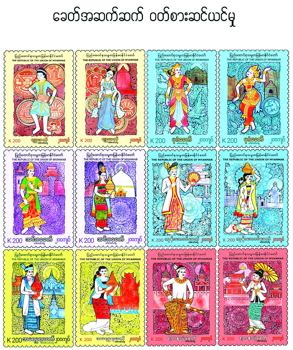မြန်မာ့ယဉ်ကျေးမှုအမွေအနှစ်များကို ပြန်လည်ဖော်ထုတ်သည့်အနေဖြင့် ခေတ်အဆက်ဆက် မြန်မာအမျိုးသားများနှင့် အမျိုးသမီးများ၏ ဝတ်စားဆင်ယင်မှုများကို အများပြည်သူများနှင့် မျိုးဆက်သစ်လူငယ်များ ပိုမိုအလေးထားမှတ်သားနိုင်စေရန် ထုတ်ဝေခဲ့သော တံဆိပ်ခေါင်းများကို တံဆိပ်ခေါင်းစုဆောင်းသူဝါသနာရှင်များ တစ်စုတစ်စည်းတည်း စုဆောင်းနိုင်ကြရန်ရည်ရွယ်၍ ခေတ်အဆက်ဆက်ဝတ်စားဆင်ယင်မှုအထိမ်းအမှတ် Block of Stamp အထူးထုတ် ၂၄၀၀ ကျပ်တန် (၂၀၀ x ၁၂) စာပို့တံဆိပ်ခေါင်းသစ် (၁) မျိုးအား ဇွန် ၂၀ ရက်၊ မြန်မာသက္ကရာဇ် ၁၃၈၇ ခုနှစ်၊ နယုန်လပြည့်ကျော် (၁၀) ရက် (သောကြာနေ့) နံနက် ၉ နာရီခွဲမှ စတင်၍ နေပြည်တော်ဗဟိုစာတိုက်ကြီး၊ ရန်ကုန်စာတိုက်ကြီး၊ မန္တလေးစာတိုက်ကြီးတို့နှင့် တိုင်းဒေသကြီး/ ပြည်နယ်များရှိ စာတိုက်ကြီးများတွင် တစ်ပြိုင်တည်းရောင်းချပေးသွားမည်ဖြစ်သည်။