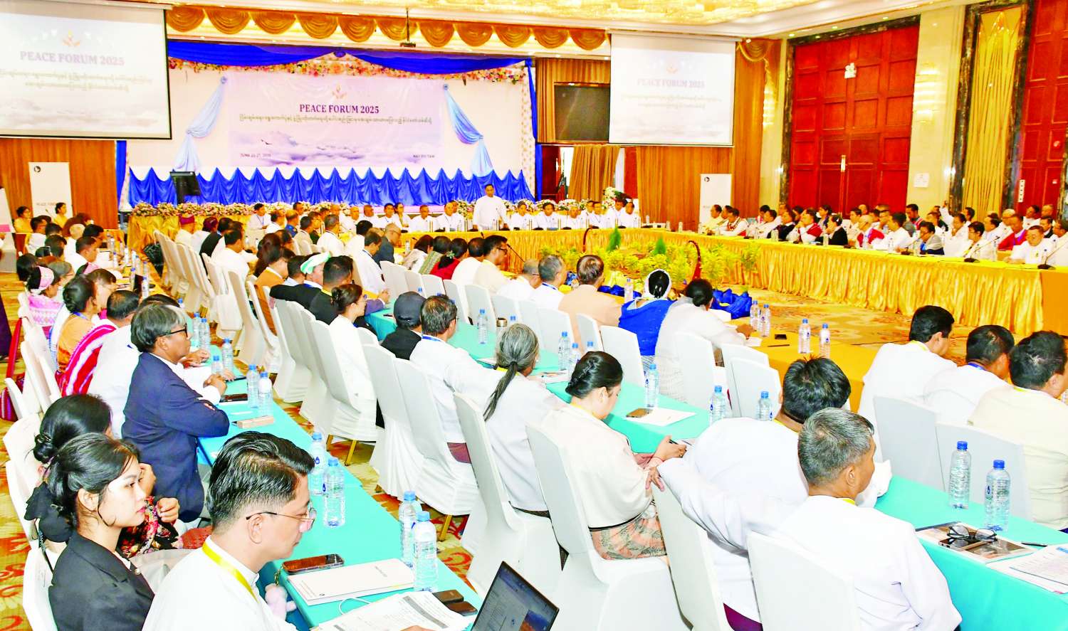 “ငြိမ်းချမ်းရေး၊ ရွေးကောက်ပွဲနှင့် ဖွံ့ဖြိုးတိုးတက်ရေးတို့ ပေါင်းစည်းခြင်းမှ အေးချမ်းသာယာဝပြောသည့် နိုင်ငံတော်သစ်ဆီသို့” သုံးသပ်ဆွေးနွေးပွဲ ငြိမ်းချမ်းရေးဖိုရမ် - Peace Forum 2025 ကို ယနေ့နံနက်ပိုင်းတွင် နေပြည်တော်ရှိ မင်္ဂလာသီရိဟိုတယ်ခန်းမ၌ တတိယနေ့အဖြစ် ဆက်လက်ကျင်းပသည်။