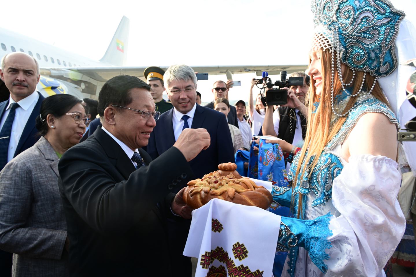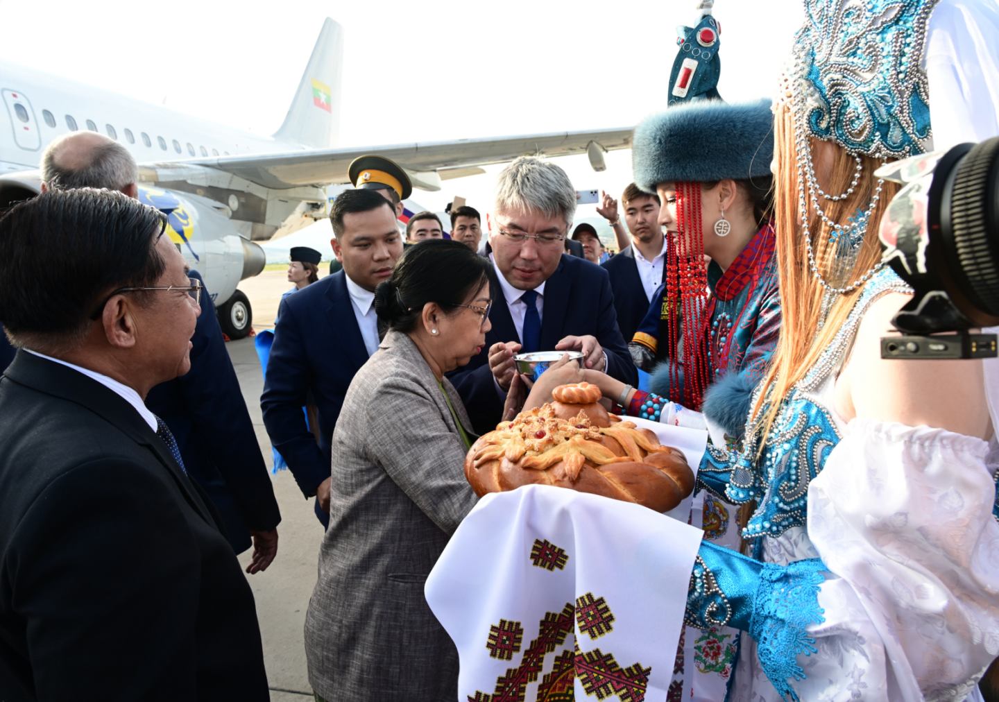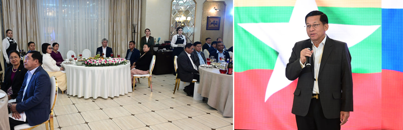 ဦးစွာ နိုင်ငံတော်စီမံအုပ်ချုပ်ရေးကောင်စီဥက္ကဋ္ဌ နိုင်ငံတော်ဝန်ကြီးချုပ် ဗိုလ်ချုပ်မှူးကြီး မင်းအောင်လှိုင်နှင့် ဇနီး ဒေါ်ကြူကြူလှ ဦးဆောင်သော မြန်မာအဆင့်မြင့်ကိုယ်စားလှယ်အဖွဲ့သည် ညစာစားပွဲနေရာသို့ ရောက်ရှိကြရာ Buryatia ပြည်နယ်၊ ပြည်နယ်အကြီးအကဲနှင့် တာဝန်ရှိသူများက လှိုက်လှဲနွေးထွေးစွာ ကြိုဆိုနှုတ်ဆက်ကြသည်။