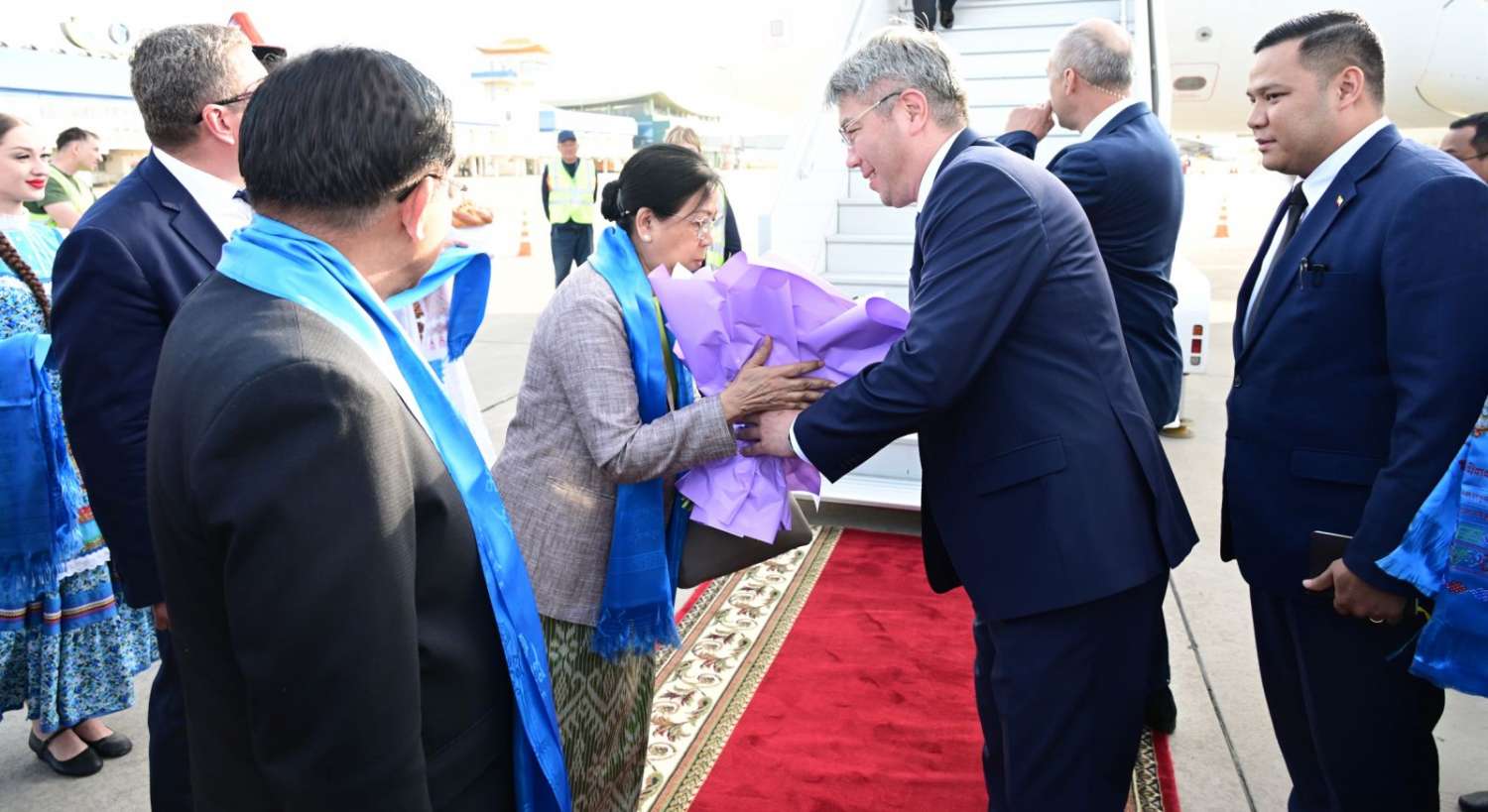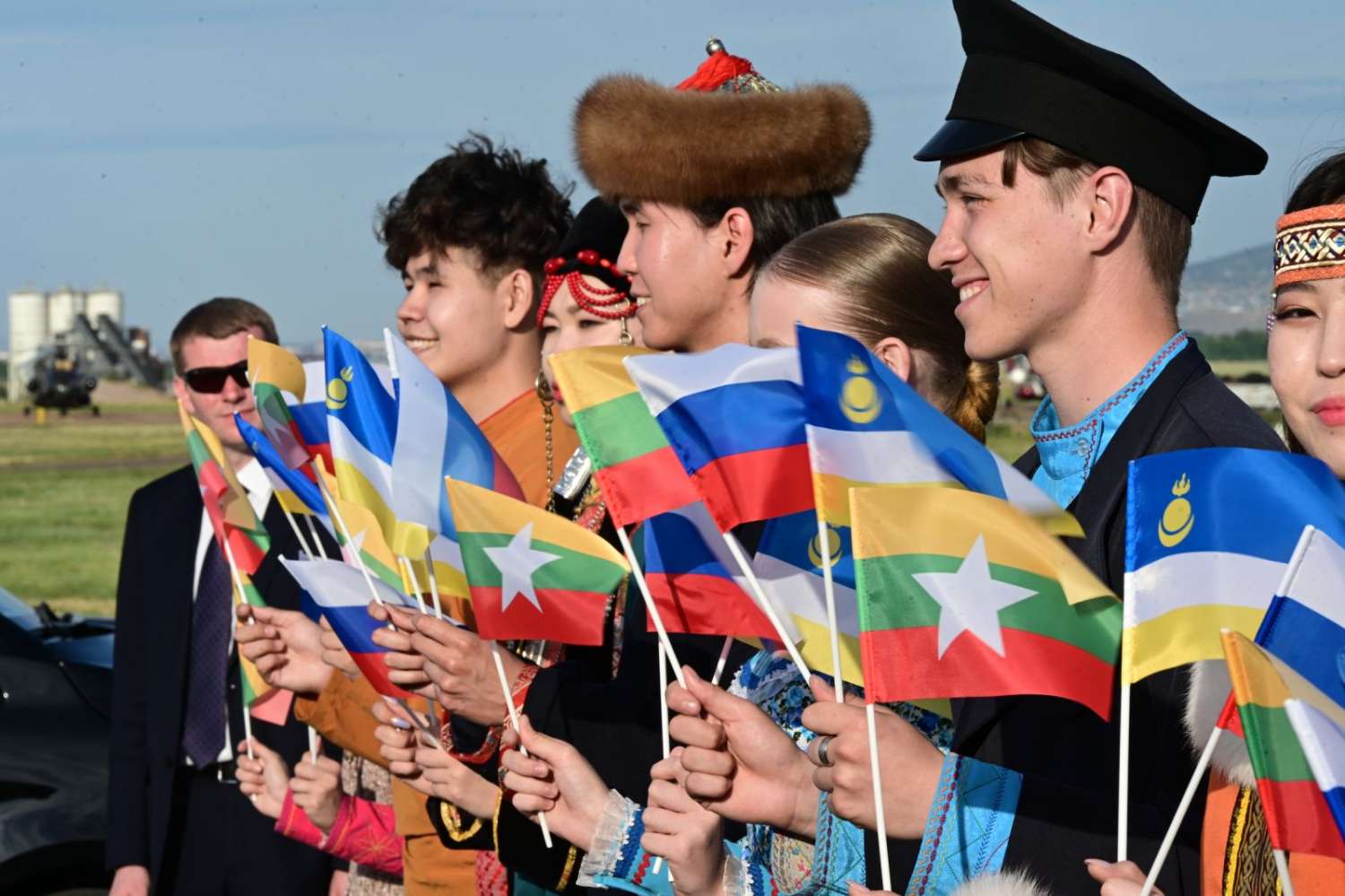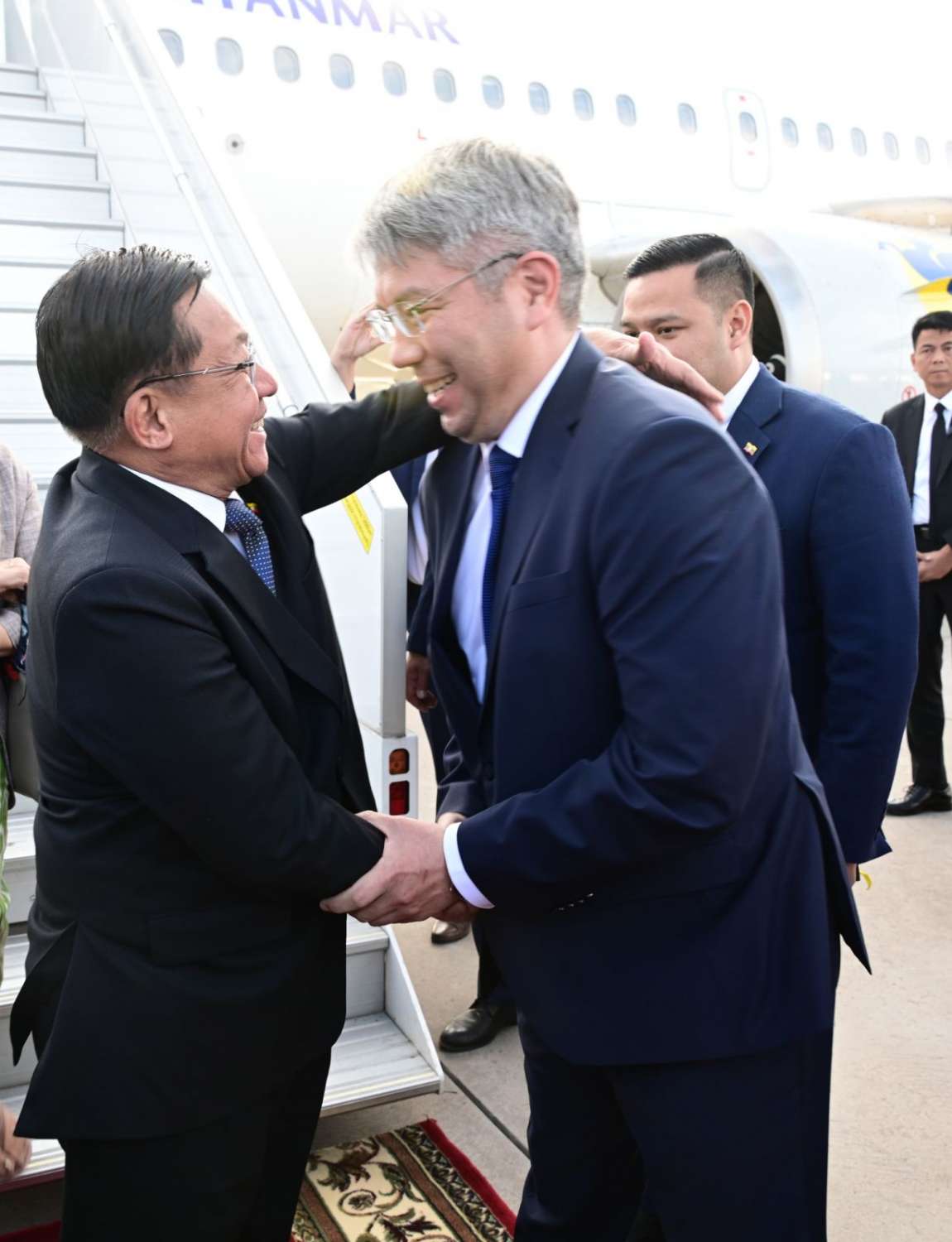 ဦးစွာ နိုင်ငံတော်စီမံအုပ်ချုပ်ရေးကောင်စီဥက္ကဋ္ဌ နိုင်ငံတော်ဝန်ကြီးချုပ် ဗိုလ်ချုပ်မှူးကြီး မင်းအောင်လှိုင်နှင့် ဇနီး ဒေါ်ကြူကြူလှ ဦးဆောင်သော မြန်မာအဆင့်မြင့်ကိုယ်စားလှယ်အဖွဲ့သည် ညစာစားပွဲနေရာသို့ ရောက်ရှိကြရာ Buryatia ပြည်နယ်၊ ပြည်နယ်အကြီးအကဲနှင့် တာဝန်ရှိသူများက လှိုက်လှဲနွေးထွေးစွာ ကြိုဆိုနှုတ်ဆက်ကြသည်။