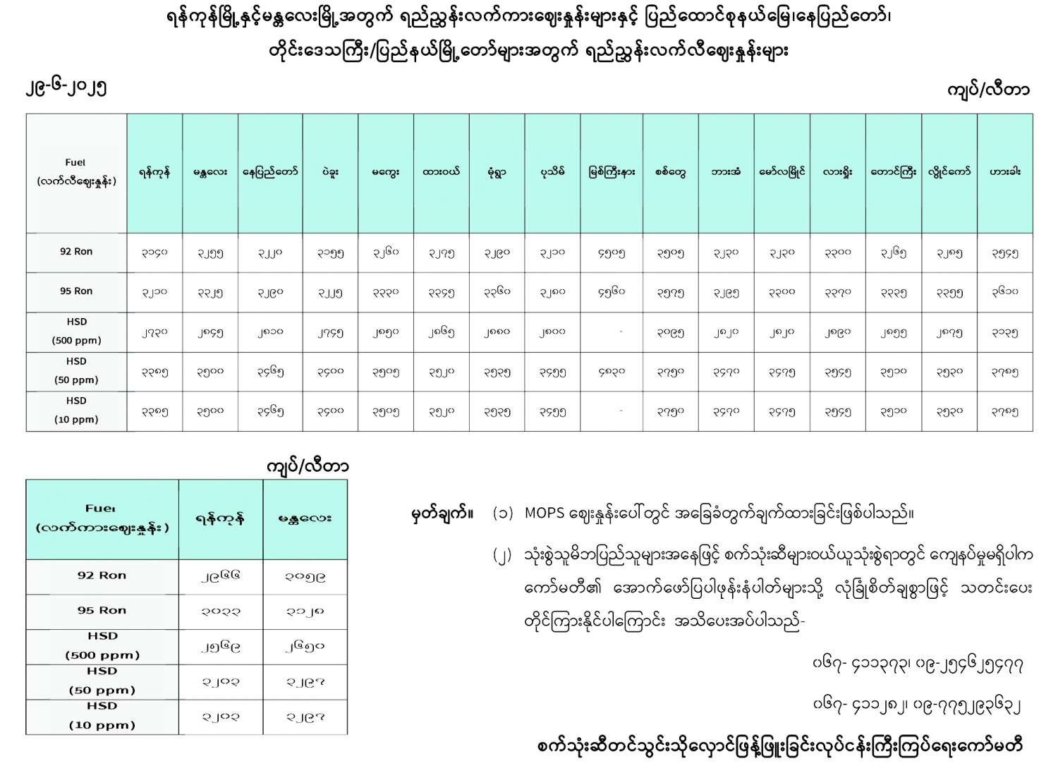 ရန်ကုန်မြို့နှင့် မန္တလေးမြို့အတွက် ရည်ညွှန်းလက်ကားဈေးနှုန်းများနှင့် ပြည်ထောင်စုနယ်မြေ နေပြည်တော်၊ တိုင်းဒေသကြီး/ ပြည်နယ် မြို့တော်များအတွက် ရည်ညွှန်းလက်လီဈေးနှုန်းများ 06/29/2025