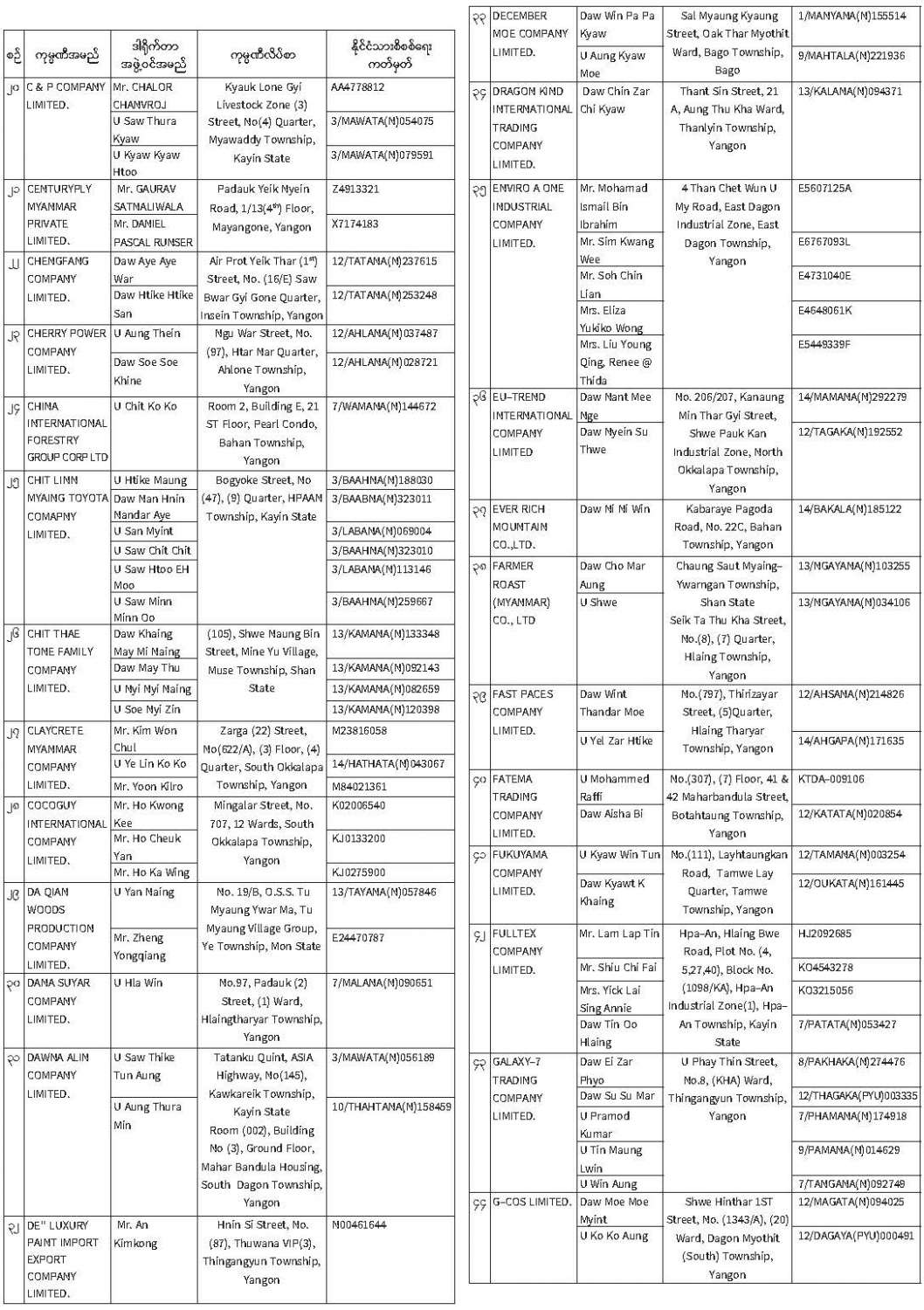 ၄။ (၂၃-၆-၂ဝ၂၅) ရက်နေ့ စိစစ်ချက်အရ ၂ဝ၁၆ ခုနှစ်မှ ၂ဝ၂ဝ ပြည့်နှစ် အတွင်း ပို့ကုန်တင်ပို့ခဲ့ပြီး ပို့ကုန်ရငွေပြန်လည်ဝင်ရောက်ရန်ကျန်ရှိသည့် ပူးတွဲပါကုမ္ပဏီ (၁၉၇) ခုသည် နိုင်ငံခြားသုံးငွေ စီမံခန့်ခွဲမှုဥပဒေ၊ စည်းမျဉ်း၊ အမိန့်ကြော်ငြာစာတို့ပါ သတ်မှတ်ချက်များအား လိုက်နာ ခြင်းမရှိသဖြင့် ကုမ္ပဏီနှင့်ကုမ္ပဏီ၏ ဒါရိုက်တာအဖွဲ့ဝင်များအား အမည်မည်းစာရင်း ထည့်သွင်းကြောင်း ကြေညာပါသည်။