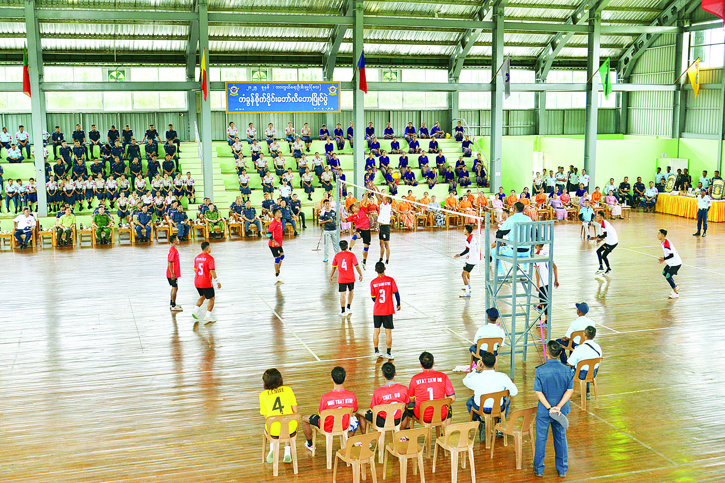 ၂၀၂၅ ခုနှစ် ကာကွယ်ရေးဦးစီးချုပ် (လေ) တံခွန်စိုက်ဒိုင်း ဘော်လီဘောပြိုင်ပွဲဖွင့်ပွဲကို ယနေ့နံနက်ပိုင်းတွင် မန္တလေးတိုင်းဒေသကြီး မိတ္ထီလာမြို့ရှိ လေကြောင်းအတတ်သင်လေတပ်စခန်းဌာနချုပ် မိုးလုံလေလုံအားကစားခန်းမ၌ ပြုလုပ်ရာ ကာကွယ်ရေးဦးစီးချုပ် (လေ) ကိုယ်စား လေတပ်စခန်းဌာနချုပ်မှူး ဗိုလ်ချုပ် ဝင်းမောင်သိန်းနှင့် တပ်မတော် (လေ) မှ အရာရှိ/စစ်သည်၊ မိသားစုများ၊ ပြိုင်ပွဲဝင်အသင်းများ၊ ဖိတ်ကြားထားသူများနှင့် အားကစားဝါသနာရှင်များ တက်ရောက်ကြသည်။