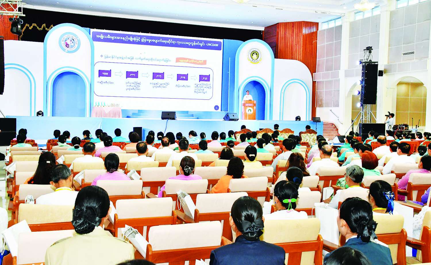 ထို့နောက် မြန်မာနိုင်ငံလုံးဆိုင်ရာ အမျိုးသမီးကော်မတီဥက္ကဋ္ဌ လူမှုဝန်ထမ်း၊ ကယ်ဆယ်ရေးနှင့် ပြန်လည်နေရာချထားရေးဝန်ကြီးဌာန ပြည်ထောင်စုဝန်ကြီး ဒေါက်တာစိုးဝင်းက အမျိုးသမီးများဖွံ့ဖြိုးတိုးတက်ရေး၊ အမျိုးသမီးအခွင့်အရေး မြှင့်တင်ဖော်ဆောင်မှုနှင့် အမျိုးသမီးများအပေါ် နည်းမျိုးစုံဖြင့် အကြမ်းဖက်ခံရမှု တားဆီးကာကွယ်ရေးဆိုင်ရာ ဆောင်ရွက်မှုများအား ရှင်းလင်းတင်ပြသည်။