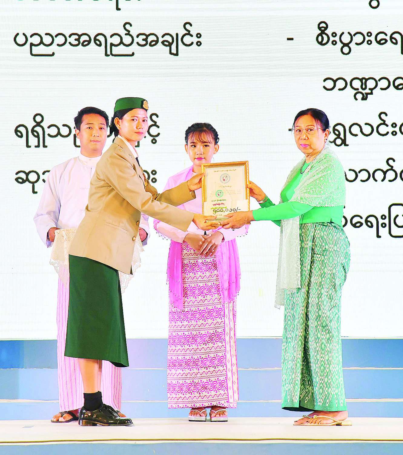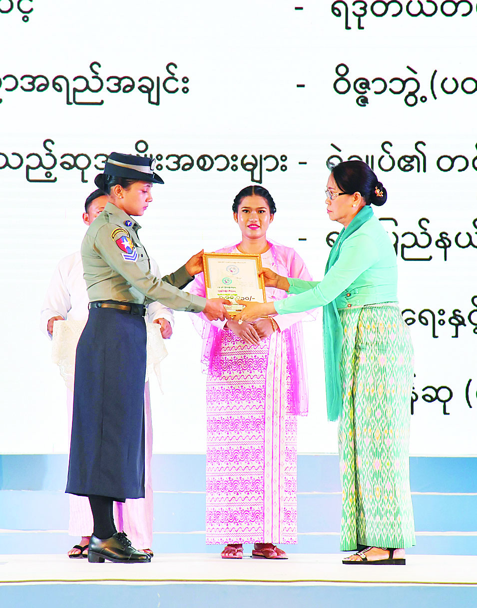 ယင်းနောက် နိုင်ငံတော်စီမံအုပ်ချုပ်ရေးကောင်စီအတွင်းရေးမှူး၏ ဇနီးက ၂၀၂၃ ခုနှစ် အမျိုးသားစာပေဆုရရှိသူ ဒေါ်မြမြသန်း (ကိုယ်စား) ဒေါ်ချိုချိုမော်နှင့် ဒေါ်ခင်ဝတ်ရည်တို့ကိုလည်းကောင်း၊ တွဲဖက်အတွင်းရေးမှူး၏ ဇနီးက ထူးချွန်အမျိုးသမီးဆုရရှိသူ ဒေါက်တာသင်းမျိုးမျိုးအောင်နှင့် အမျိုးသမီးစီးပွားရေးစွမ်းဆောင်ရှင်ဆုရရှိသူ ဒေါ်ကြွေကြွေဇင် တို့ကိုလည်းကောင်း ဂုဏ်ပြုဆုတံဆိပ်၊ ဂုဏ်ပြုမှတ်တမ်းလွှာနှင့် ဂုဏ်ပြုဆုငွေများ ပေးအပ်ချီးမြှင့်ကြသည်။