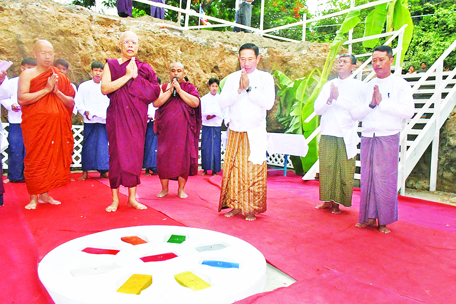 ဦးစွာ ဒုတိယဗိုလ်ချုပ်ကြီး သက်ပုံနှင့် တက်ရောက်လာကြသူများက စစ်ကိုင်းတိုင်းဒေသကြီး ရွှေကျင်သံဃနာယကအဖွဲ့ဥက္ကဋ္ဌ ရတနာဓုဝံကျောင်းတိုက်ဆရာတော် ဘဒ္ဒန္တဇောတိကထံမှ ငါးပါးသီလခံယူဆောက်တည်ကြသည်။ ထို့နောက်ဆရာတော်များက အန္တရာယ်ကင်းပရိတ်တရားတော်များ ရွတ်ဖတ်ကြပြီး လေးကျွန်းမာရ်အောင် မြတ်စွာဘုရားပန္နက်တင်ခြင်းမင်္ဂလာနှင့် အုတ်မြစ်ချခြင်းမင်္ဂလာကို ပြုလုပ်ကြသည်။ ၎င်းနောက် ရွှေမိုးငွေမိုးများ ရွာသွန်း၍ အခမ်းအနားကို အောင်မြင်စွာရုပ်သိမ်းပြီး သံဃာတော်များအား နေ့ဆွမ်းဆက်ကပ်လှူဒါန်းခဲ့ကြောင်း သတင်းရရှိသည်။