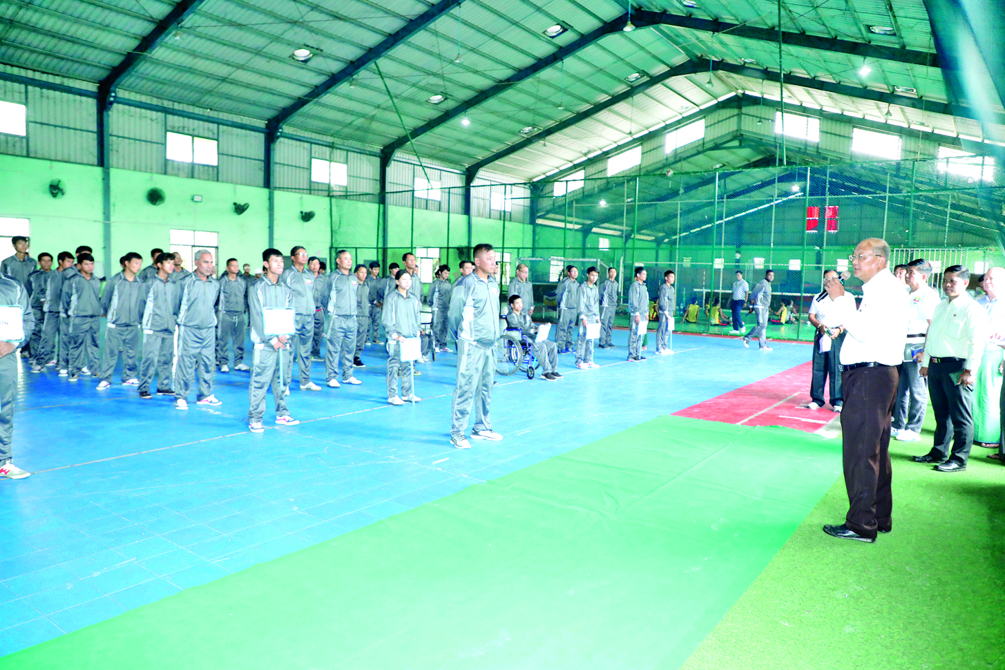 ယင်းနောက် ပြည်ထောင်စုဝန်ကြီးနှင့် အဖွဲ့သည် ဒဂုံမြို့သစ် (တောင်ပိုင်း) ရှိ Multipurpose Stadium သို့ ရောက်ရှိ၍ အားကစားရုံအတွင်း လိုက်လံကြည့်ရှုစစ်ဆေးပြီး မြန်မာနိုင်ငံမသန်စွမ်းအားကစားအဖွဲ့ချုပ်၌ (၁၃) ကြိမ်မြောက် အာဆီယံမသန်စွမ်း အားကစားပြိုင်ပွဲအတွက် စခန်းဝင်လေ့ကျင့်နေသော အားကစားသမားများနှင့် ရင်းရင်းနှီးနှီးတွေ့ဆုံ၍ အမှာစကားပြောကြားကာ ထိုင်လျက်ဘော်လီဘောအားကစားသမားများ လေ့ကျင့်ယှဉ်ပြိုင်နေမှုနှင့် ထမင်းစားဆောင်အတွင်း အားကစားသမားများ ကျွေးမွေးရန်ပြင်ဆင်ထားရှိမှုတို့ကို ကြည့်ရှုအားပေးသည်။