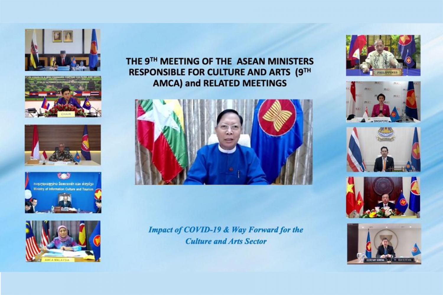 ၂၀၂၀ ပြည့်နှစ်၏ အာဆီယံအလှည့်ကျ ဥက္ကဋ္ဌဖြစ်သည့် ကမ္ဘောဒီးယားနိုင်ငံနှင့် အာဆီယံအတွင်းရေးမှူးချုပ်ရုံးတို့က ကြီးမှူးကျင်းပသည့် (၉) ကြိမ်မြောက် အာဆီယံ ယဉ်ကျေးမှုနှင့် အနုပညာဝန်ကြီးများအဆင့် အစည်းအဝေးနှင့် ဆက်စပ်အစည်းအဝေးများကို ယနေ့နံနက် ၈ နာရီခွဲတွင် Video Conferencing စနစ်ဖြင့် ကျင်းပသည်။