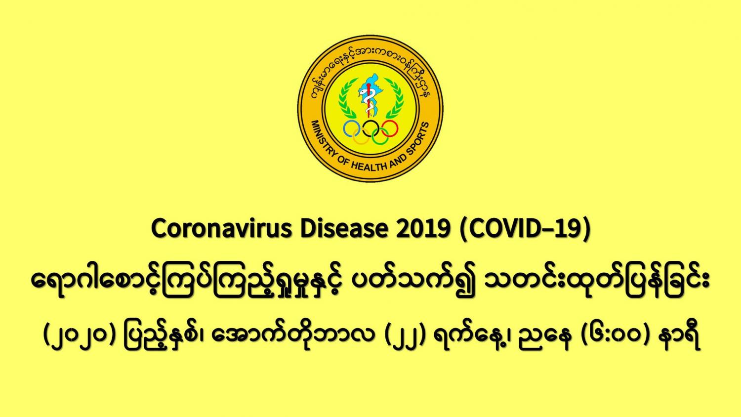 COVID-19 ရောဂါစောင့်ကြပ်ကြည့်ရှုမှုနှင့်ပတ်သက်၍ သတင်းထုတ်ပြန်ခြင်း 10/22/2020 (၂၂-၁၀-၂၀၂၀) ရက်နေ့၊ ညနေ (၆:၀၀)နာရီ (၂၁-၁၀-၂၀၂၀) ရက်နေ့ဓာတ်ခွဲစစ်ဆေးမှုများတွင် တွေ့ရှိခဲ့သော ဓာတ်ခွဲအတည်ပြုလူနာ (၁,၁၉၄) ဦး၏ မြို့နယ်အလိုက် တွေ့ရှိရမှုအခြေအနေမှာ အောက်ပါအတိုင်း ဖြစ်ပါသည်။ # Ministry of Health and Sports, Myanmar