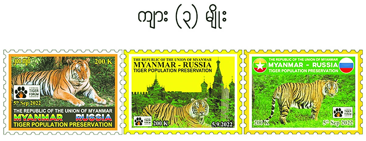 မြန်မာ-ရုရှား နှစ်နိုင်ငံ ကျားထိန်းသိမ်းရေးအထိမ်းအမှတ် Block of Stamp အထူးထုတ်၂၀၀ ကျပ်တန် သုံးခုပါ စာပို့တံဆိပ်ခေါင်းသစ်တစ်မျိုး ရောင်းချမည်