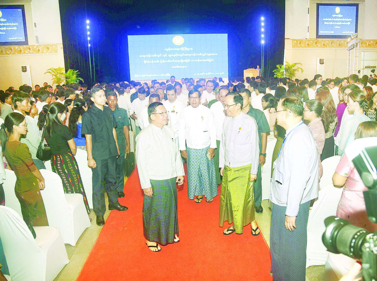 ဦးစွာ နိုင်ငံတော်စီမံအုပ်ချုပ်ရေးကောင်စီဥက္ကဋ္ဌ နိုင်ငံတော်ဝန်ကြီးချုပ်သည် အခမ်းအနားကျင်းပမည့် မြန်မာကွန်ဗင်းရှင်းစင်တာသို့ရောက်ရှိကြရာ ကျန်းမာရေးဝန်ကြီးဌာန ပြည်ထောင်စုဝန်ကြီး ဒေါက်တာသက်ခိုင်ဝင်းနှင့် ကျန်းမာရေးဝန်ထမ်းများက ကြိုဆိုနှုတ်ဆက်ကြသည်။