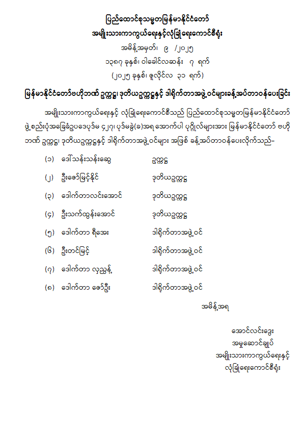 မြန်မာနိုင်ငံတော်ဗဟိုဘဏ် ဥက္ကဋ္ဌ၊ ဒုတိယဥက္ကဋ္ဌနှင့် ဒါရိုက်တာအဖွဲ့ဝင်များ ခန့်အပ်တာဝန်ပေးခြင်း 07/31/2025