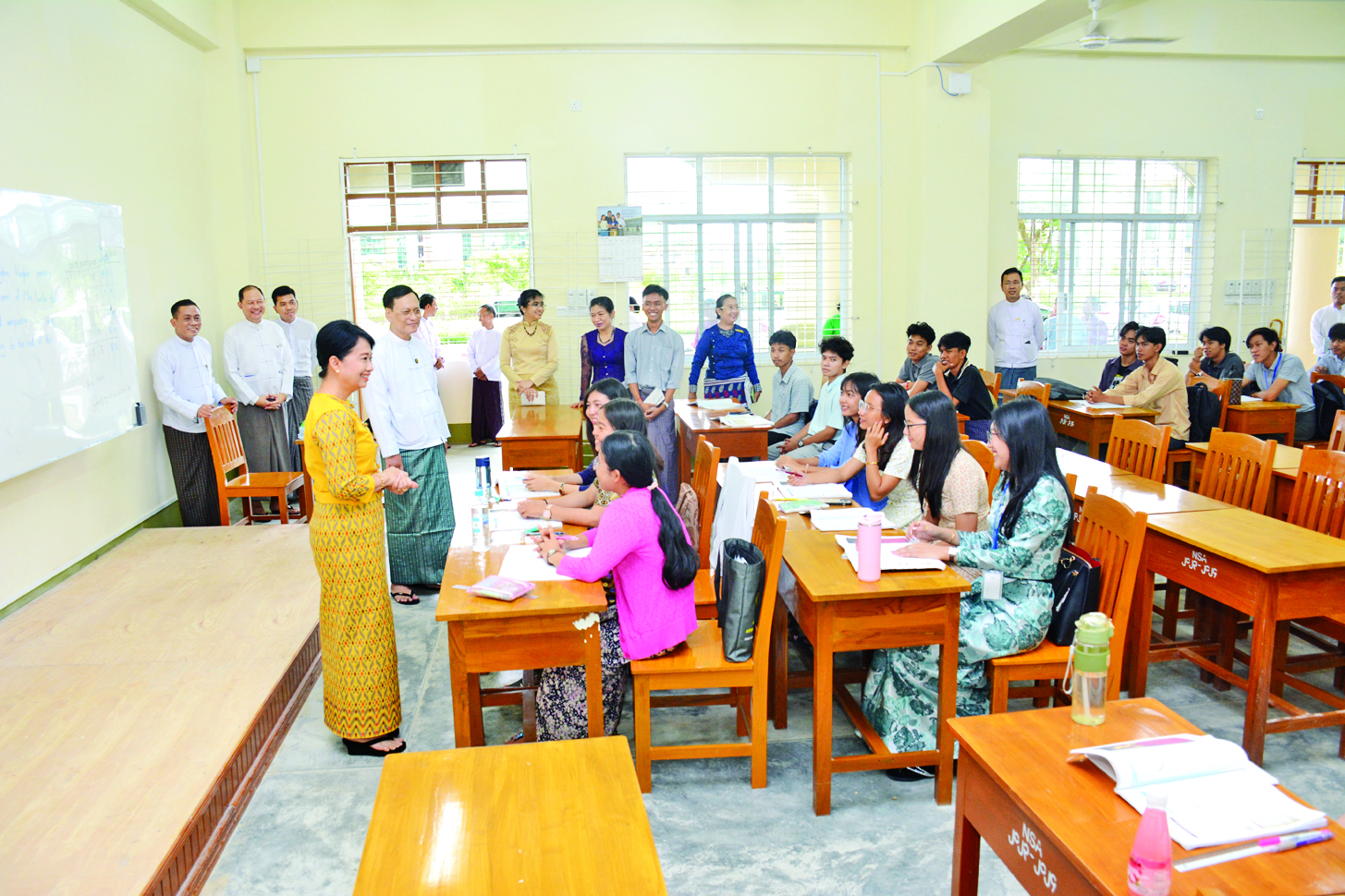 ထို့နောက် လေးထပ်စာသင်ဆောင်ရှိ သိပ္ပံလက်တွေ့ခန်းများနှင့် စာသင်ခန်းများတွင် စာတွေ့လက်တွေ့သင်ယူနေကြသည့် ကျောင်းသား ကျောင်းသူများနှင့်တွေ့ဆုံ၍ မိမိတို့စိတ်ဝင်စားသည့် ဘာသာရပ်များကို ပိုင်နိုင်စွာနားလည်တတ်ကျွမ်းအောင် လေ့လာသင်ယူခြင်းဖြင့် မိမိတို့၏အနာဂတ်ကောင်းများ ရရှိနိုင်မည်ဖြစ်ပြီး ကိုယ်လက်ကျန်းမာကြံ့ခိုင်ရေးအတွက် အားကစားလှုပ်ရှားမှုများကိုလည်း စိတ်ပါဝင်စားစွာဆောင်ရွက်ကြရန် အားပေးစကားပြောကြားကာ လိုအပ်သည်များကို ဖြည့်ဆည်းဆောင်ရွက်ပေးခဲ့ကြောင်း သိရသည်။
