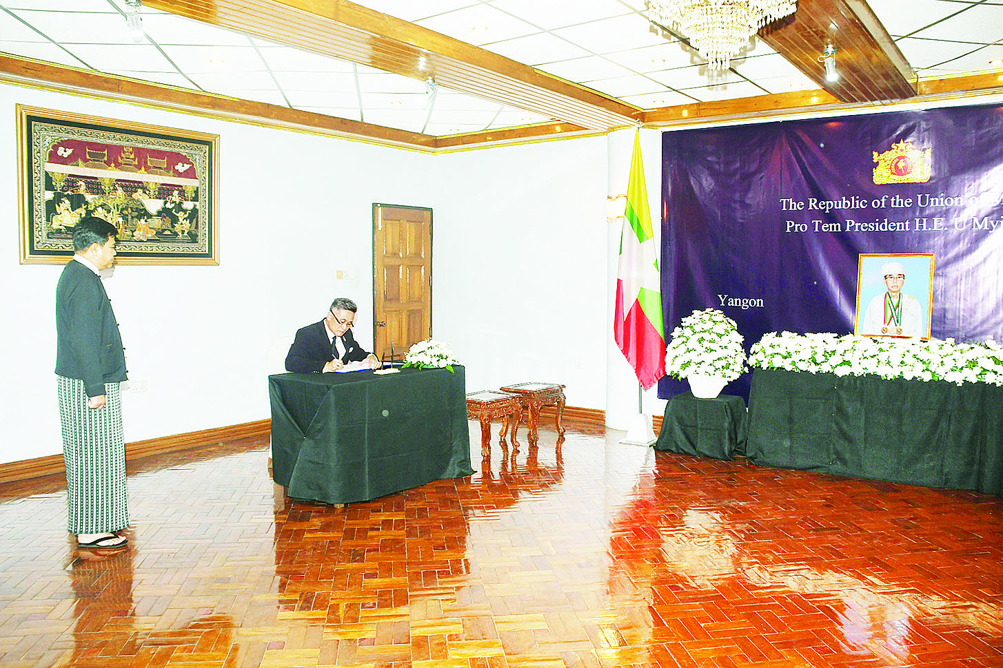 ပြည်ထောင်စုသမ္မတမြန်မာနိုင်ငံတော်၊ ယာယီသမ္မတ ဦးမြင့်ဆွေသည် ဩဂုတ် ၇ ရက်တွင်ကွယ်လွန်ခဲ့သည့်အတွက် ဝမ်းနည်းကြောင်းမှတ်တမ်းစာအုပ်ကို ရန်ကုန်မြို့၊ စကားဝါလမ်းရှိ နိုင်ငံခြားရေးဝန်ကြီးဌာန၌ ဩဂုတ် ၈ ရက်မှစတင်၍ ဖွင့်လှစ်ထားရာ မြန်မာနိုင်ငံဆိုင်ရာ သံအမတ်ကြီးများနှင့် သံရုံးအကြီးအကဲများက ဝမ်းနည်းကြောင်း လာရောက်လက်မှတ်ရေးထိုးခဲ့ကြသည်။