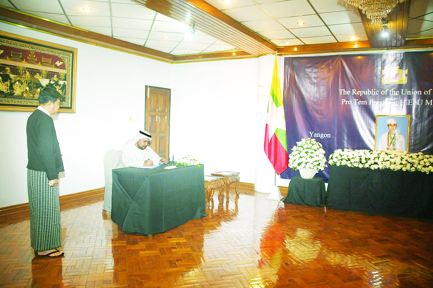 ယနေ့တွင် မြန်မာနိုင်ငံဆိုင်ရာ သံရုံးအကြီးအကဲများဖြစ်သည့် နီပေါသံအမတ်ကြီး H.E. Mr. Harishchandra Ghimire ၊ ထိုင်းသံအမတ်ကြီး H.E. Mr. Mogkol Visitstump၊ ဘင်္ဂလားဒေ့ရှ် သံအမတ်ကြီး Dr. Md. Monwar Hossain ၊ ဘရာဇီးသံအမတ်ကြီး H.E. Mr. Gustavo Rocha de Menezes ၊ အိန္ဒိယသံအမတ်ကြီး H.E. Mr. Abhay Thakur ၊ ယူအေအီးသံအမတ်ကြီး H.E. Mr. Mutaz Abdullah Abduljaleel Mohamed Al Faheem ၊ တရုတ်သံအမတ်ကြီး H.E. Ms. Ma Jia၊ ကမ္ဘောဒီးယား သံအမတ်ကြီး H.E. Mr. CHENG Manith ၊ လာအိုသံအမတ်ကြီး H.E. Mr. Bounphieng CHANTHAVONG နှင့် အစ္စရေးသံရုံးယာယီတာဝန်ခံ Mrs. Ruth Zakh ၊ တီမောလက်စ်တေ သံရုံးယာယီတာဝန်ခံ Mr. Olandino Rui de Andrade နှင့် ဟိုလီဆီးသံရုံး ယာယီတာဝန်ခံ၏ ကိုယ်စားလှယ် Fr. Hilary တို့က ဝမ်းနည်းကြောင်းမှတ်တမ်းစာအုပ်တွင် လာရောက်လက်မှတ်ရေးထိုးခဲ့ကြသည်။