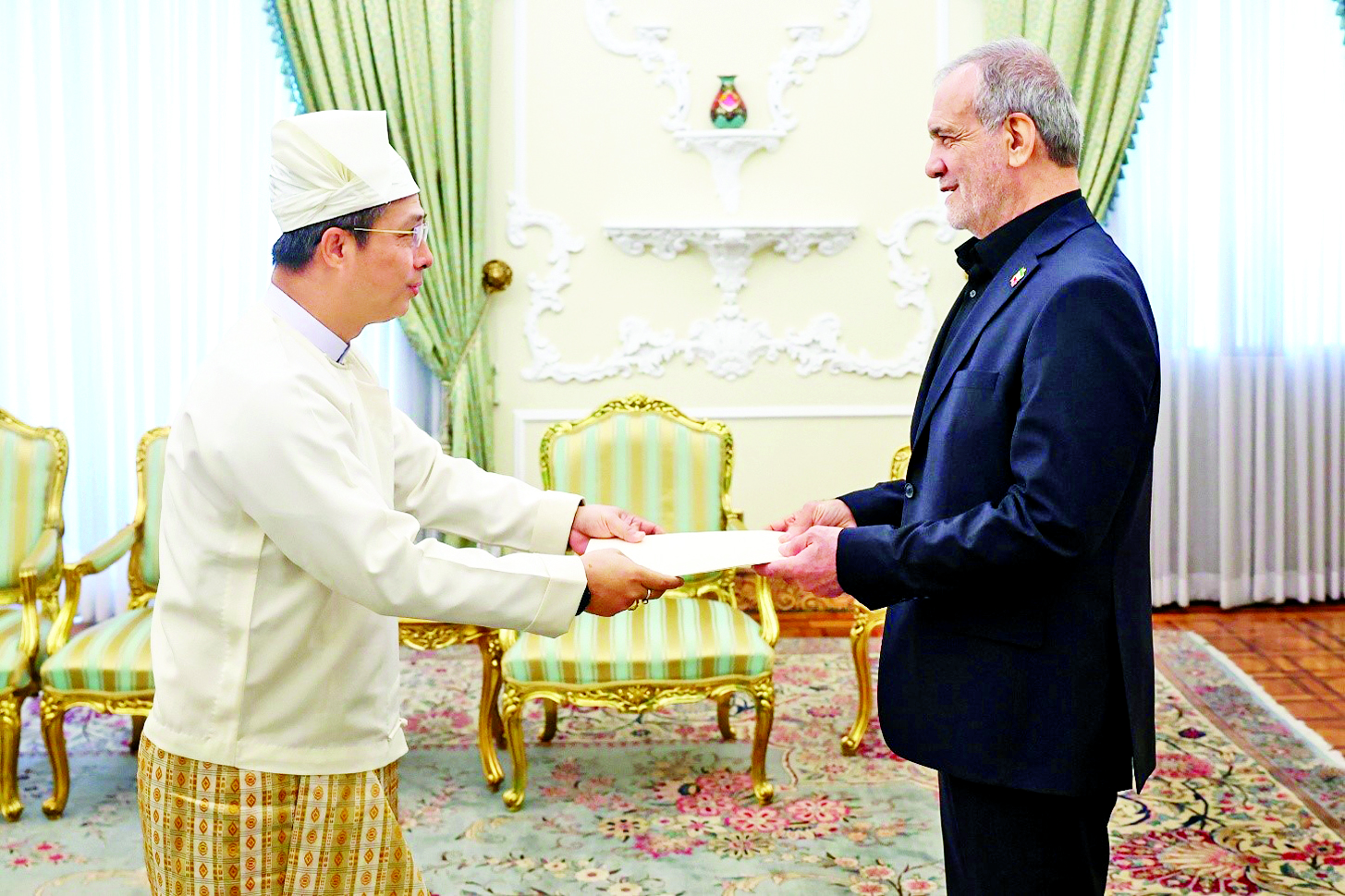 အီရန်အစ္စလာမ်မစ်သမ္မတနိုင်ငံဆိုင်ရာ အထူးအာဏာကုန်လွှဲအပ်ခြင်းခံရသော ပြည်ထောင်စုသမ္မတမြန်မာနိုင်ငံတော် သံအမတ်ကြီး ဦးဇော်ဦးသည် ၎င်း၏ ခန့်အပ်လွှာကို ၂၀၂၅ ခုနှစ် ဩဂုတ် ၁၀ ရက်တွင် တီဟီရန်မြို့ရှိ သမ္မတနန်းတော်၌ အီရန်အစ္စလာမ်မစ် သမ္မတနိုင်ငံ သမ္မတမစ္စတာ မာဆော့ပါဇက်ရှ်ကီရမ်ထံ ပေးအပ်ခဲ့ပြီးဖြစ်သည်။
