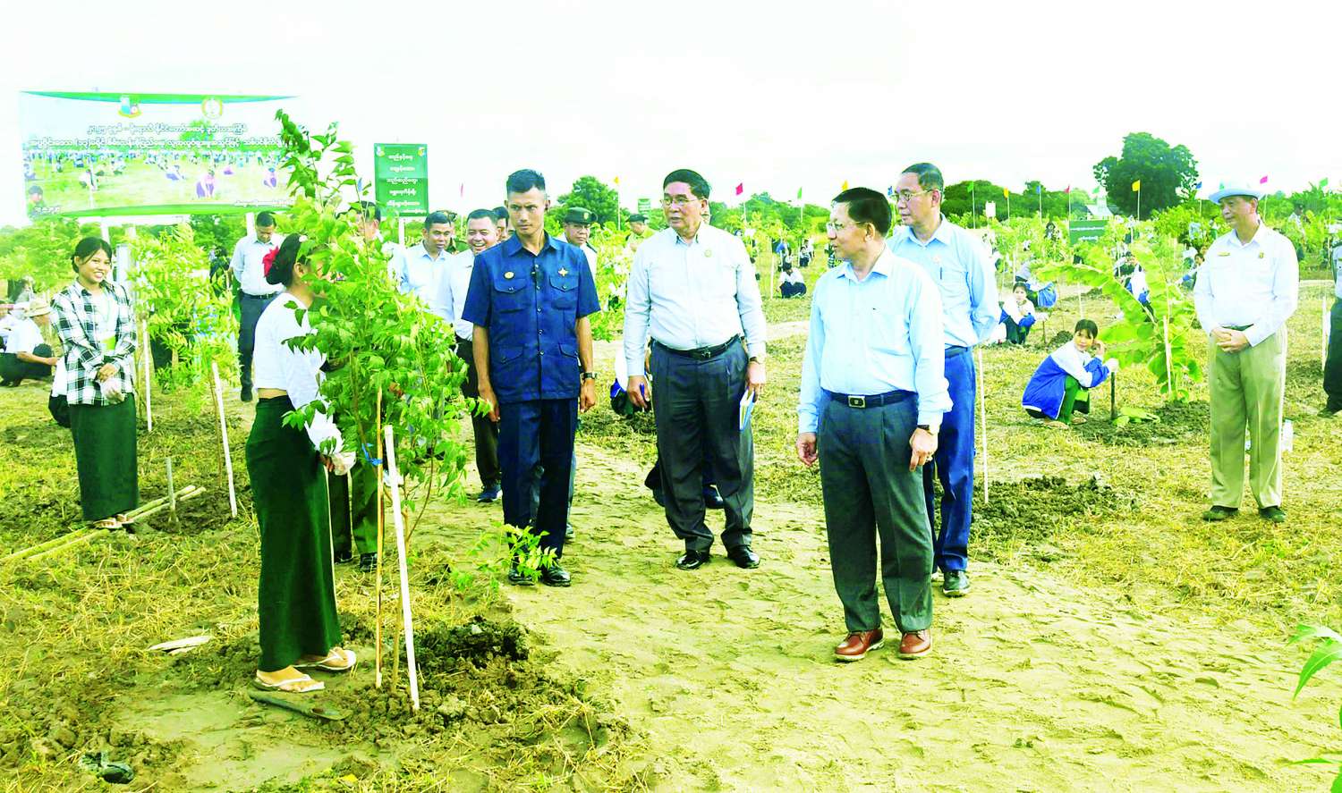 ထို့နောက် နိုင်ငံတော်လုံခြုံရေးနှင့် အေးချမ်းသာယာရေးကော်မရှင်ဥက္ကဋ္ဌသည် ၂၀၂၅ ခုနှစ် မိုးရာသီလူထုလှုပ်ရှားမှုအသွင်ဖြင့်ပြုလုပ်သည့် ဒုတိယအကြိမ် သစ်ပင်စိုက်ပျိုးပွဲတော်သို့ တက်ရောက်လာကြသူများက ပျိုးပင်များအား တပျော်တပါးစိုက်ပျိုးနေမှုကို လှည့်လည်ကြည့်ရှုအားပေးသည်။