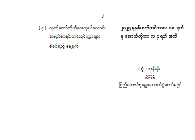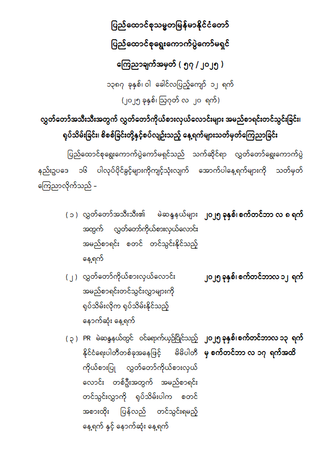 လွှတ်တော်အသီးသီးအတွက် လွှတ်တော်ကိုယ်စားလှယ်လောင်းများ အမည်စာရင်းတင်သွင်းခြင်း၊ ရုပ်သိမ်းခြင်း၊ စိစစ်ခြင်းတို့နှင့် စပ်လျဉ်းသည့် နေ့ရက်များသတ်မှတ်ကြေညာခြင်း 08/20/2025