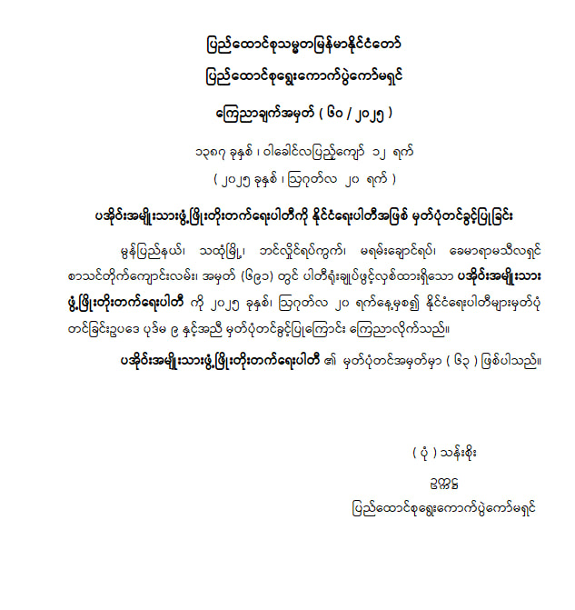 ပအိုဝ်းအမျိုးသားဖွံ့ဖြိုးတိုးတက်ရေးပါတီကို နိုင်ငံရေးပါတီအဖြစ် မှတ်ပုံတင်ခွင့်ပြုခြင်း
