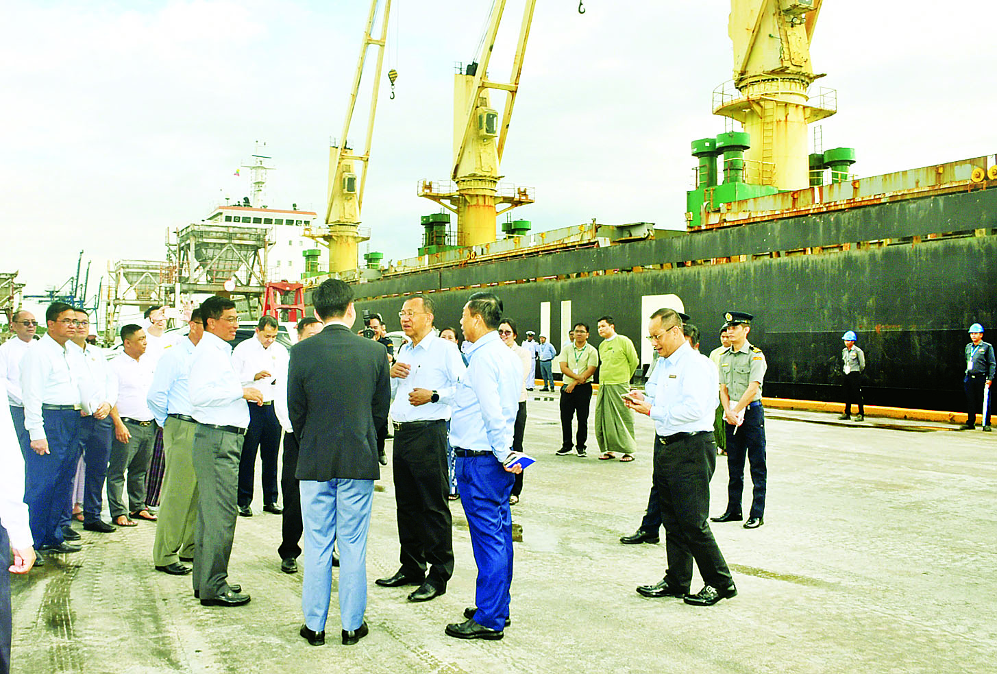 ထို့နောက် ပြည်ထောင်စုဝန်ကြီးများ၊ ဒုတိယဝန်ကြီး ဦးဟန်ဝင်းအောင်နှင့် တာဝန်ရှိသူများသည် သီလဝါအထူးစီးပွားရေးဇုန်ရှိ Myanmar Interna-tional Terminals Thilawa (MITT) ဆိပ်ကမ်းနှင့် Danko စက်သုံးဆီဆိပ်ကမ်းများသို့လည်းကောင်း၊ Wilmar Myanmar Port Terminals (Thilawa) ဆိပ်ကမ်းရှိ စားသုံးဆီသိုလှောင်ကန်များသို့လည်းကောင်း၊ သာကေတဆိပ်ကမ်း၌ ကုန်ပစ္စည်းများ ကုန်တင်ကုန်ချ ဆောင်ရွက်နေမှုကိုလည်းကောင်း ကြည့်ရှုစစ်ဆေးခဲ့ကြောင်း သိရသည်။