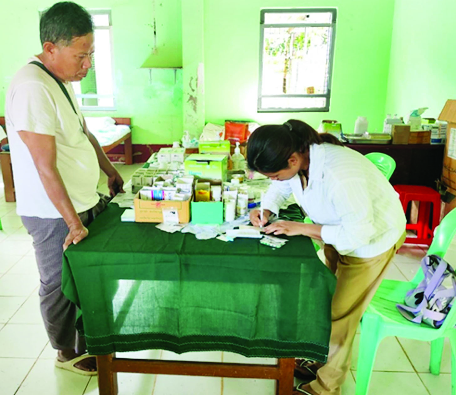 ထိုသို့ ဆောင်ရွက်ပေးလျက်ရှိရာ ယနေ့တွင် ပြည်သူ့ဆေးရုံကြီး၌ ပြင်ပလူနာ စုစုပေါင်း ၂၀ တို့ကို ငှက်ဖျားရောဂါ၊ တုပ်ကွေးရောဂါ၊ အထွေထွေရောဂါတို့နှင့်ပတ်သက်၍ လိုအပ်သည့် ကျန်းမာရေး စစ်ဆေးကုသပေးခြင်းများ ဆောင်ရွက်ပေးခြင်း၊ ဒေသခံတိုင်းရင်းသားပြည်သူ ၁၈ ဦးကို သွေးအမျိုးအစား စစ်ဆေးပေးခြင်းနှင့် ဒေသခံပြည်သူ ၈ ဦးကို ငှက်ဖျားရောဂါပိုးစစ်ဆေးပေးခြင်းများ ဆောင်ရွက်ပေးသည်။ ထို့ပြင် အတွင်းလူနာအဖြစ် တက်ရောက်ဆေးကုသမှု ခံယူလျက်ရှိသူ ၂၆ ဦးတို့အား ဆေးအဖွဲ့များက လိုအပ်သည့် ကျန်းမာရေးစောင့်ရှောက်မှုလုပ်ငန်းများ ဆောင်ရွက်ပေးလျက်ရှိကြောင်း သတင်းရရှိသည်။
