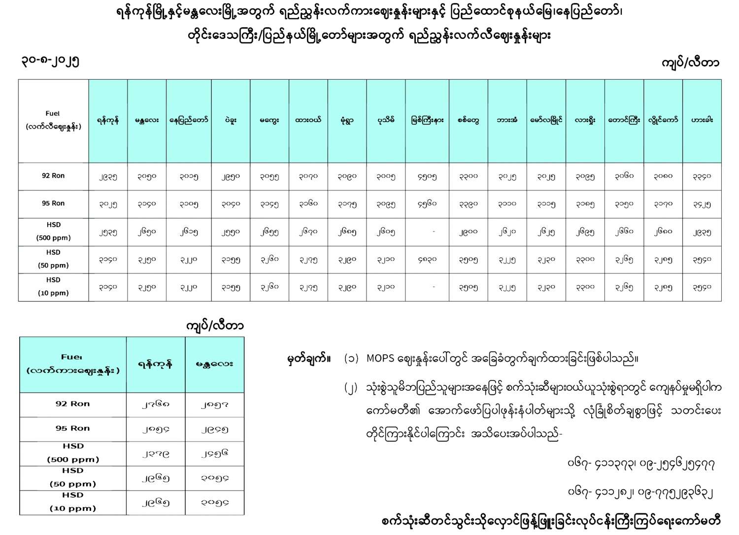 ရန်ကုန်မြို့နှင့် မန္တလေးမြို့အတွက် ရည်ညွှန်းလက်ကားဈေးနှုန်းများနှင့် ပြည်ထောင်စုနယ်မြေ နေပြည်တော်၊ တိုင်းဒေသကြီး/ပြည်နယ် မြို့တော်များအတွက် ရည်ညွှန်းလက်လီဈေးနှုန်းများ 08/30/2025