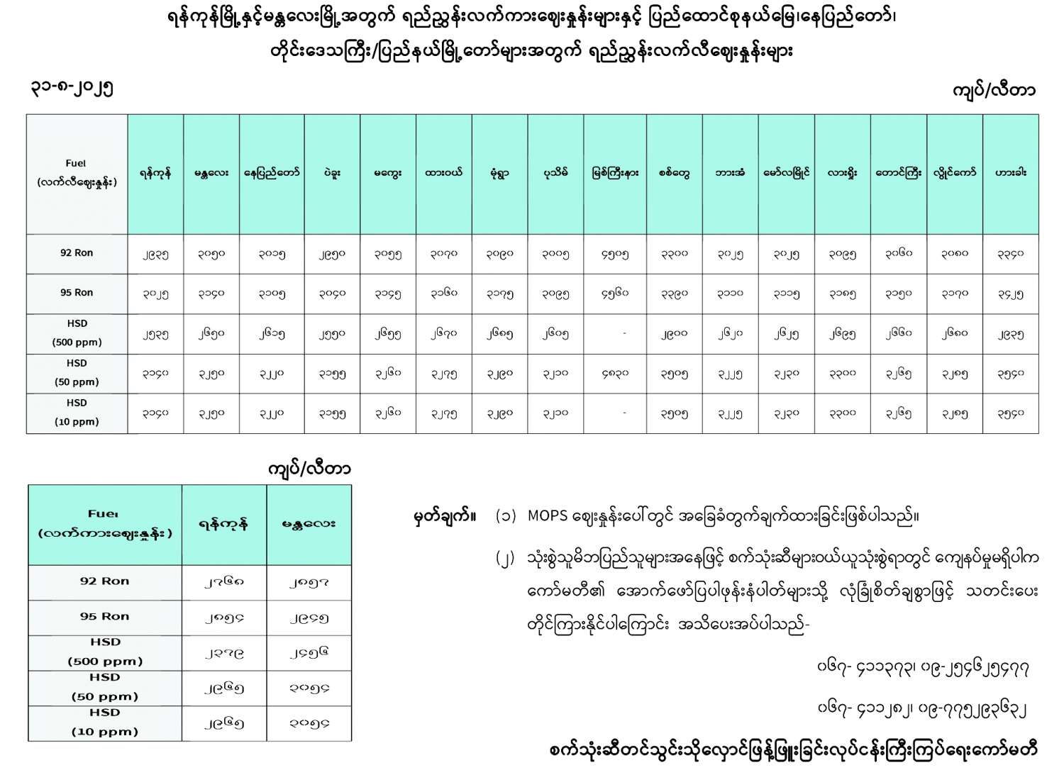 ရန်ကုန်မြို့နှင့် မန္တလေးမြို့အတွက် ရည်ညွှန်းလက်ကားဈေးနှုန်းများနှင့် ပြည်ထောင်စုနယ်မြေ နေပြည်တော်၊ တိုင်းဒေသကြီး/ပြည်နယ် မြို့တော်များအတွက် ရည်ညွှန်းလက်လီဈေးနှုန်းများ 08/31/2025