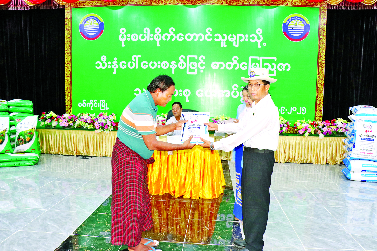 ထို့နောက် တိုင်းဒေသကြီး ဝန်ကြီးများနှင့် တာဝန်ရှိသူများက စစ်ကိုင်းမြို့နယ်အတွင်းရှိ ကျေးရွာငါးရွာမှ မိုးစပါးစိုက်တောင်သူများအား ယူရီးယား၊ ကွန်ပေါင်းသွင်းအားစုဓာတ်မြေဩဇာများ ပေးအပ်ကြသည်။