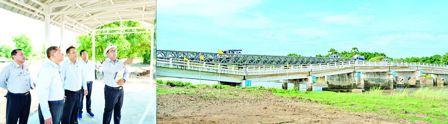 ထို့နောက် ငလျင်ဒဏ်ကြောင့် ပျက်စီးသွားသည့် ပလိပ် - တံတားဦး လမ်းမိုင်တိုင် (၄/၅) ရှိ ပန်းလောင်တံတားတည်ဆောက်ရေး လုပ်ငန်းခွင်ရှင်းလင်းဆောင်သို့ ရောက်ရှိရာ တာဝန်ခံအင်ဂျင်နီယာက ငလျင်ဒဏ်ကြောင့် ပျက်စီးခဲ့မှုအခြေအနေနှင့် တံတားအသစ်တည်ဆောက်ရန် လျာထားတည်နေရာတို့ကို ရှင်းလင်းတင်ပြရာ ဒုတိယဝန်ကြီးက အဆိုပါလမ်းသည် ရန်ကုန် - မန္တလေး အမြန်လမ်းမကြီးနှင့် ရန်ကုန်- တောင်ငူ- မန္တလေး (လမ်းဟောင်း) တို့ကို အရှေ့-အနောက် ဆက်သွယ်ပေးထားသော လမ်းကွန်ရက်ချိတ်ဆက်ထားသည့် လမ်းတစ်လမ်းဖြစ်သဖြင့် ပြည်သူများ လွယ်ကူလျင်မြန်စွာ ခရီးသွားလာနိုင်ရန်နှင့် ဒေသများမှထွက်ရှိသည့် ကုန်စည်များ လွယ်ကူလျင်မြန်စွာ သယ်ယူပို့ဆောင်နိုင်ရန်အတွက် အရေးပါသော တံတားဖြစ်ကြောင်း ပြောကြားပြီး အသစ်တည်ဆောက်မည့် လျာထားလမ်းအူကြောင်းနေရာကို ကြည့်ရှုစစ်ဆေးသည်။