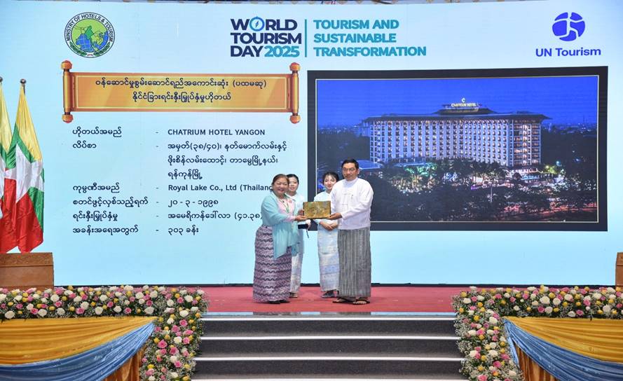 ယင်းနောက် UN Tourism အထွေထွေအတွင်းရေးမှူးချုပ် Mr. Zurab Pololikashvili ၏ သတင်းစကားရုပ်သံ video clip နှင့် မြန်မာနိုင်ငံတွင် ဆောင်ရွက်လျက်ရှိသော ခရီးသွားလုပ်ငန်း အမျိုးအစားများအကြောင်း Video Clip ကို ပြသသည်။ ထို့နောက် နိုင်ငံတော်ဝန်ကြီးချုပ် ဦးညိုစောက ဝန်ဆောင်မှုစွမ်းဆောင်ရည်အကောင်းဆုံးဆုရရှိသော နိုင်ငံခြားရင်းနှီးမြှုပ်နှံမှု ဟိုတယ်များနှင့် ဖက်စပ်ဟိုတယ်များ၊ ၂၀၂၅ ခုနှစ်၊ ကမ္ဘာ့ခရီးသွားလုပ်ငန်းနေ့အထိမ်းအမှတ် စာတမ်းဖတ်ပြိုင်ပွဲနှင့် ရောင်စုံဓာတ်ပုံပြိုင်ပွဲများတွင် ဆုရရှိကြသူများအား ဂုဏ်ပြုဆုနှင့် ဂုဏ်ပြုမှတ်တမ်းလွှာများ ပေးအပ်ချီးမြှင့်သည်။