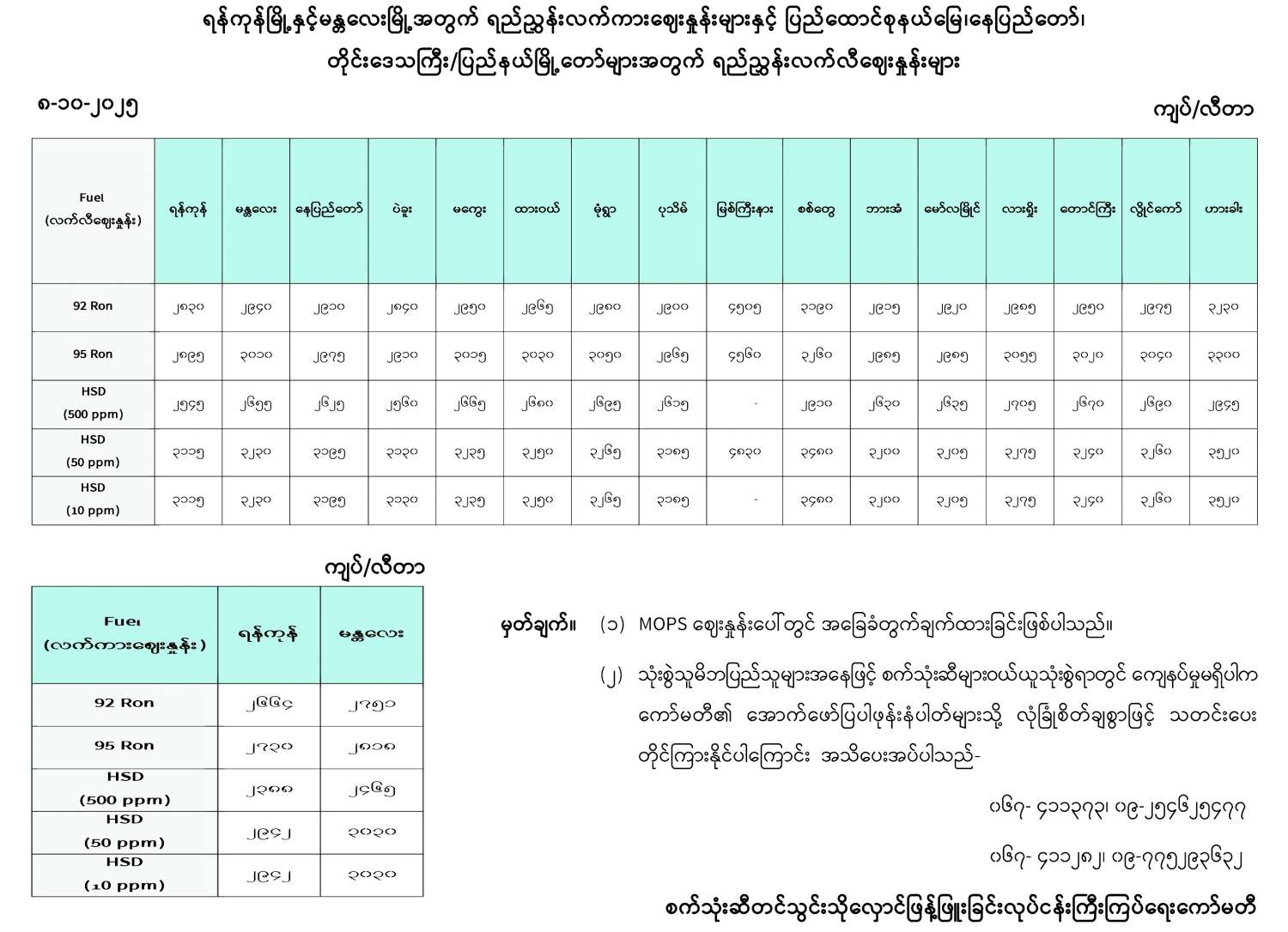 ရန်ကုန်မြို့နှင့် မန္တလေးမြို့အတွက် ရည်ညွှန်းလက်ကားဈေးနှုန်းများနှင့် ပြည်ထောင်စုနယ်မြေ နေပြည်တော်၊ တိုင်းဒေသကြီး/ပြည်နယ် မြို့တော်များအတွက် ရည်ညွှန်းလက်လီဈေးနှုန်းများ 10/08/2025