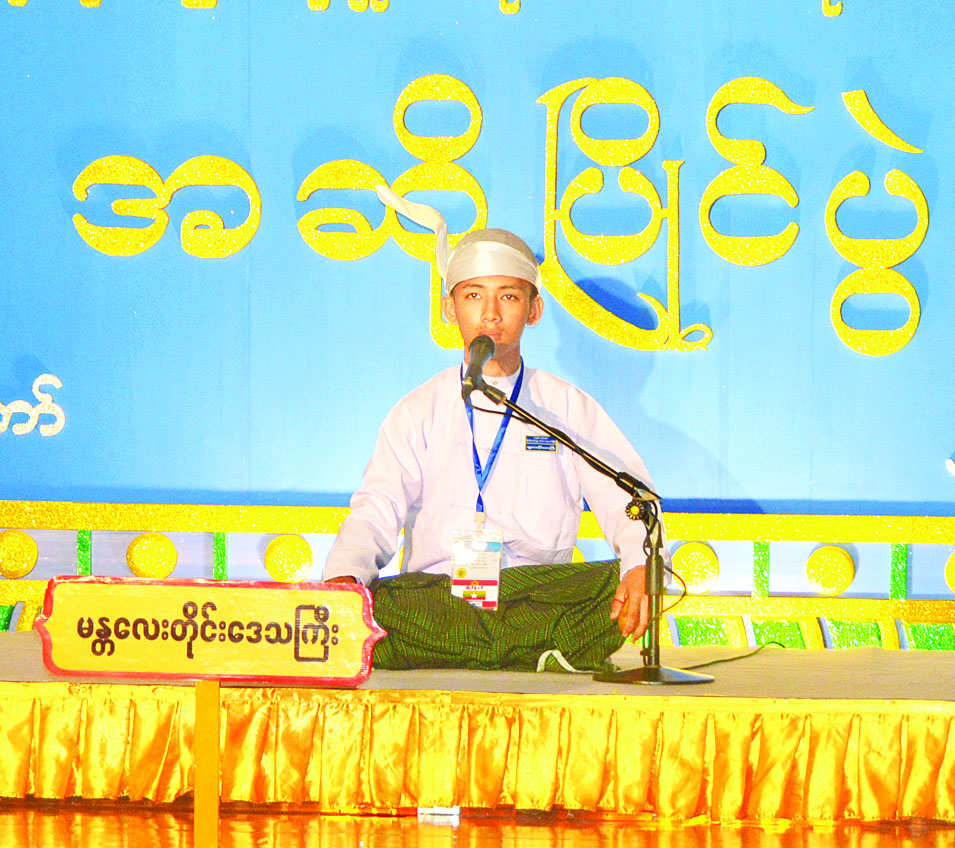 ထို့အတူ အရေးပြိုင်ပွဲကို သာသနာရေးနှင့် ယဉ်ကျေးမှု ဝန်ကြီးဌာန ယဉ်ကျေးမှုရတနာ ခန်းမ၌ ကျင်းပရာ အခြေခံပညာအဆင့် (အသက် ၁၅ နှစ်မှ ၂၀ အတွင်း) အမျိုးသား/ အမျိုးသမီး ပြိုင်ပွဲတွင် ကချင်ပြည်နယ်၊ ရခိုင်ပြည်နယ်၊ မကွေးတိုင်းဒေသကြီး၊ ကရင်ပြည်နယ်၊ စစ်ကိုင်းတိုင်း ဒေသကြီး၊ မွန်ပြည်နယ်၊ ရန်ကုန်တိုင်းဒေသကြီး၊ ဧရာဝတီတိုင်း ဒေသကြီး၊ ပဲခူးတိုင်းဒေသကြီး၊ မန္တလေးတိုင်းဒေသကြီးနှင့် ချင်း ပြည်နယ်တို့မှ ပြိုင်ပွဲဝင်များက “ကျောင်းနေစဉ်” ခေါင်းစဉ်ဖြင့် လည်းကောင်း၊ အဆင့်မြင့်ပညာ အဆင့် အမျိုးသား/အမျိုးသမီး ပြိုင်ပွဲတွင်ကယားပြည်နယ်၊ မန္တလေးတိုင်းဒေသကြီး၊ ဧရာဝတီတိုင်းဒေသကြီး၊ တနင်္သာရီတိုင်းဒေသကြီး၊ ရန်ကုန်တိုင်းဒေသကြီး၊ ရှမ်းပြည်နယ်၊ စစ်ကိုင်းတိုင်းဒေသ ကြီး၊ မကွေးတိုင်းဒေသကြီး၊ ရခိုင် ပြည်နယ်၊ ပဲခူးတိုင်းဒေသကြီး၊ ချင်းပြည်နယ်နှင့် မွန်ပြည်နယ် တို့မှ ပြိုင်ပွဲဝင်များက “လူချွန် လူကောင်းတို့ ဂုဏ်ရည်” ခေါင်းစဉ် ဖြင့်လည်းကောင်း ဂီတရသစုံလင်စွာ ဖော်ကျူးတေးဖွဲ့ ယှဉ်ပြိုင် ကြသည်။