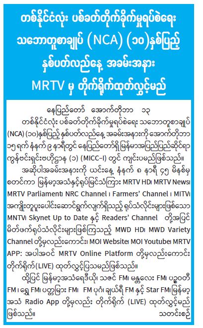 တစ်နိုင်ငံလုံးပစ်ခတ်တိုက်ခိုက်မှုရပ်စဲရေးသဘောတူစာချုပ် (NCA) (၁၀) နှစ်ပြည့် နှစ်ပတ်လည်နေ့ အခမ်းအနား MRTV မှ တိုက်ရိုက်ထုတ်လွှင့်မည်