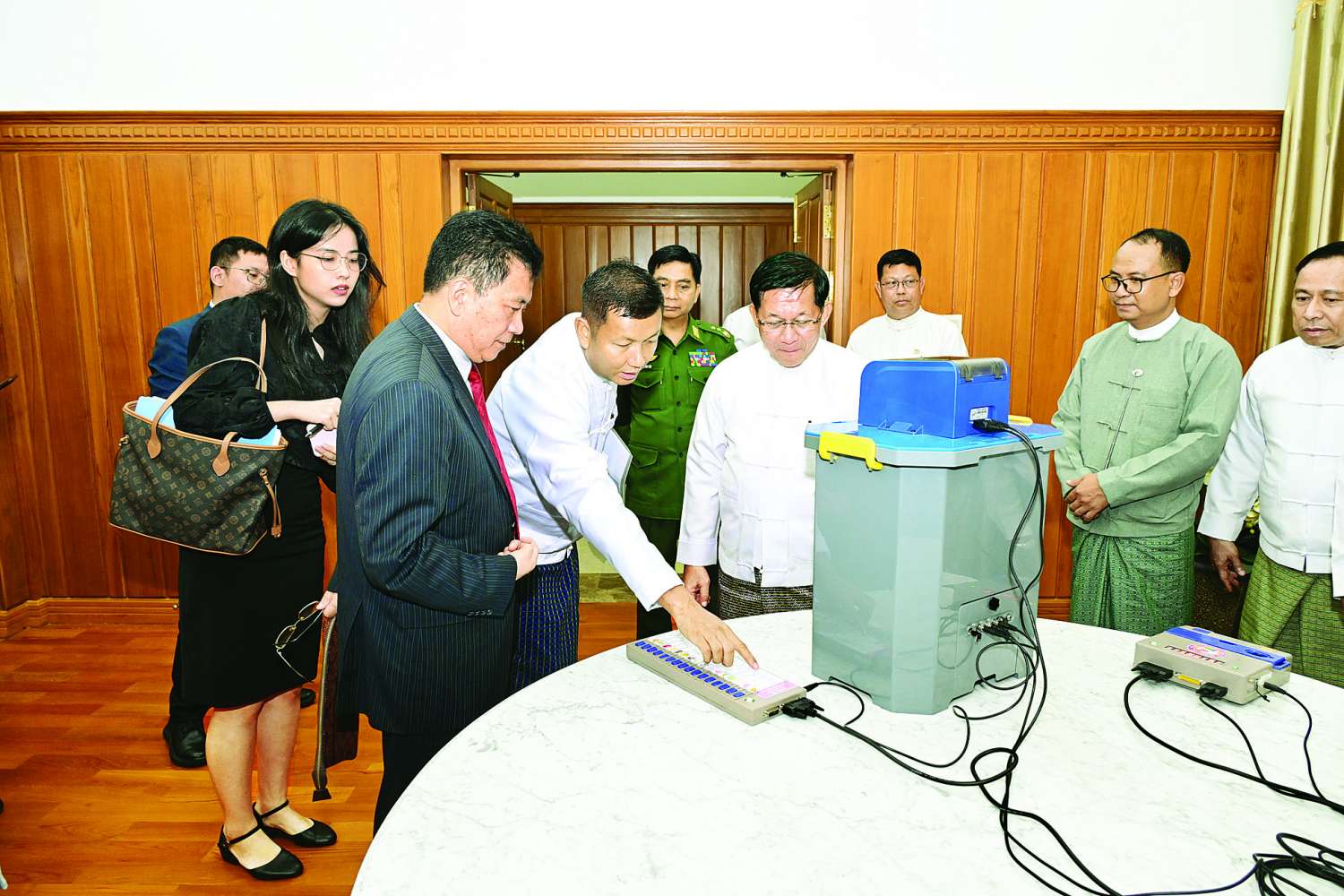 တွေ့ဆုံပွဲအပြီးတွင် နိုင်ငံတော်ယာယီသမ္မတ နိုင်ငံတော်လုံခြုံရေးနှင့် အေးချမ်းသာယာရေးကော်မရှင်ဥက္ကဋ္ဌက တရုတ်နိုင်ငံခြားရေးဝန်ကြီးဌာန၊ အာရှရေးရာအထူးကိုယ်စားလှယ်အား ရွေးကောက်ပွဲကျင်းပပြုလုပ်စဉ် အသုံးပြုမည့် မြန်မာအီလက်ထရောနစ်မဲပေးစက်(MEVM) စက်များအားပြသရာ ရွေးကောက်ပွဲကော်မရှင်မှ တာဝန်ရှိသူများက မဲပေးစက်၏ လုပ်ငန်းလုပ်ဆောင်မှုအဆင့်ဆင့်အား ရှင်းလင်းပြသခဲ့ပြီး တရုတ်နိုင်ငံခြားရေးဝန်ကြီးဌာန၊ အာရှရေးရာအထူး ကိုယ်စားလှယ်၏ သိရှိလိုသည့် မေးမြန်းမှုများကို ပြန်လည်ဖြေကြားခဲ့ကြောင်း သတင်းရရှိသည်။